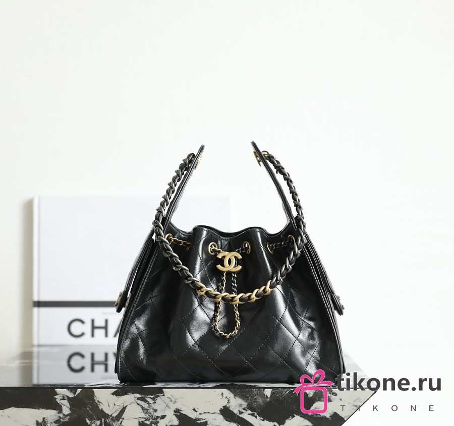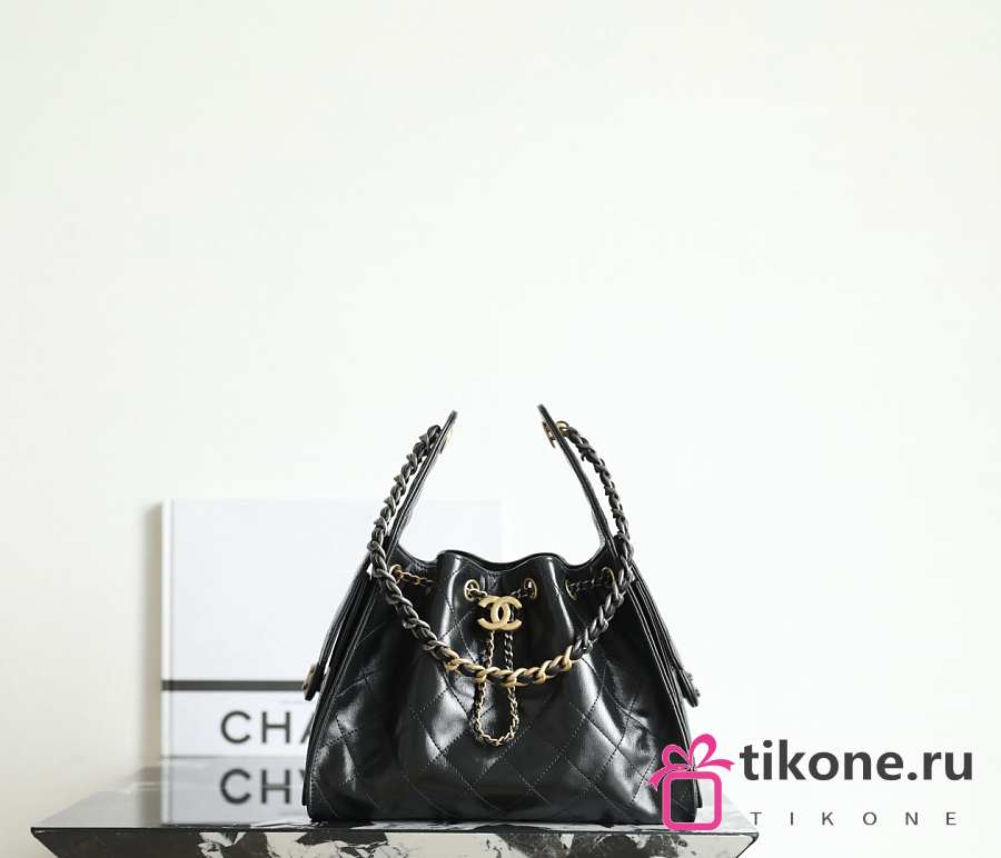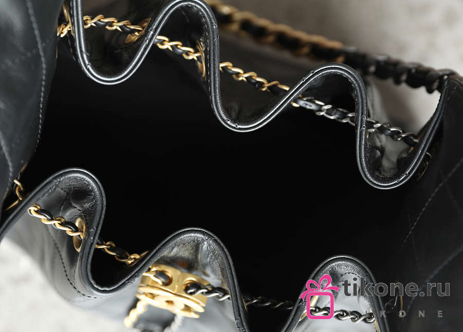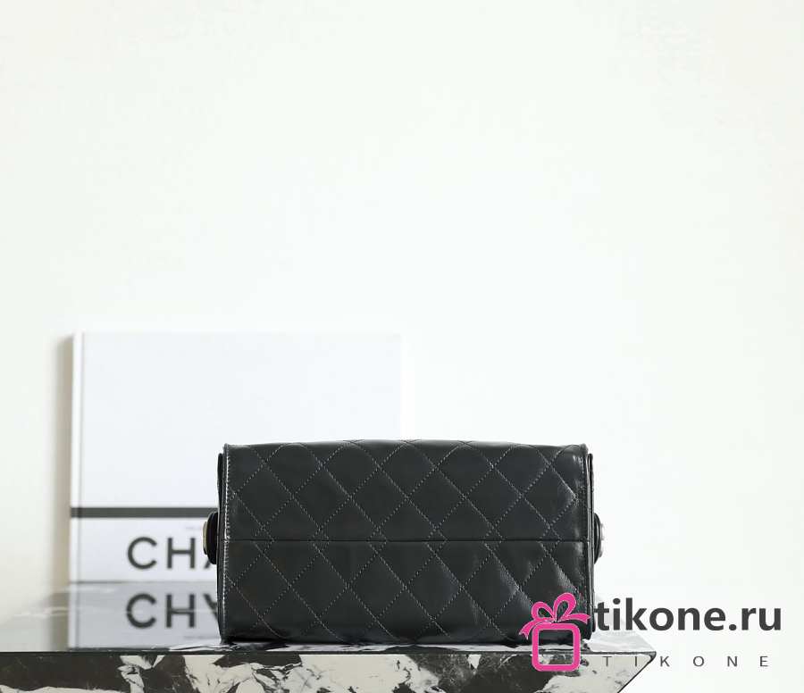 Chanel 25 Handbag Small Shiny Crumpled Calfskin Gold Tone Metal Black - 30x26x14cm