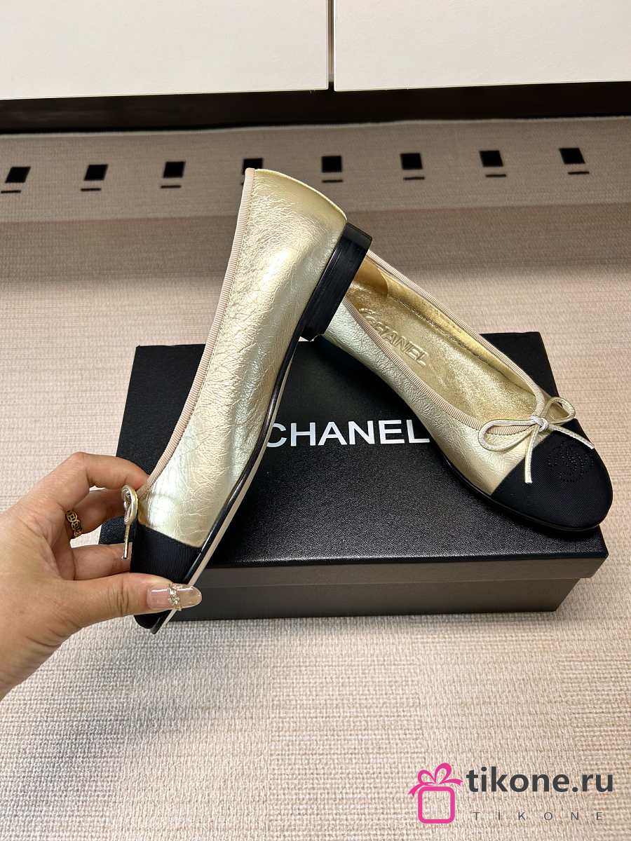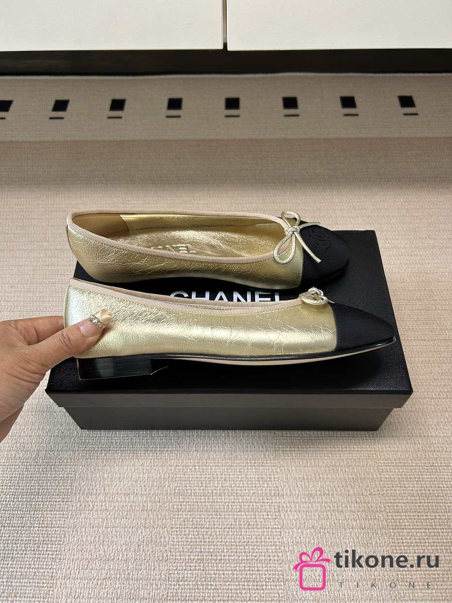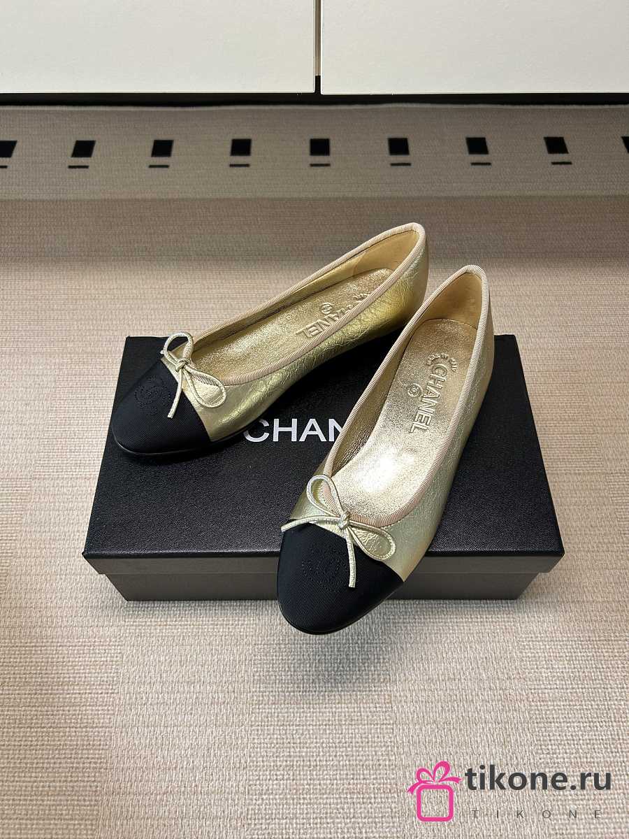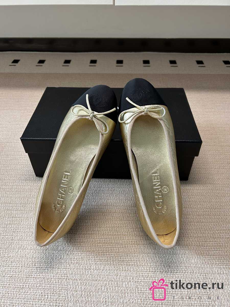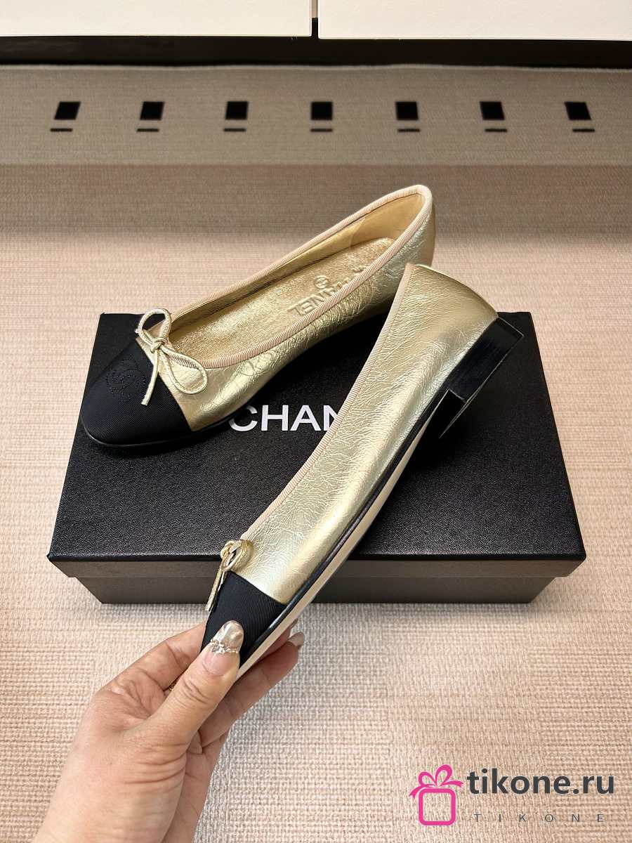 Chanel Ballet Flats Laminated Lambskin & Grosgrain Light Gold & Black G02819