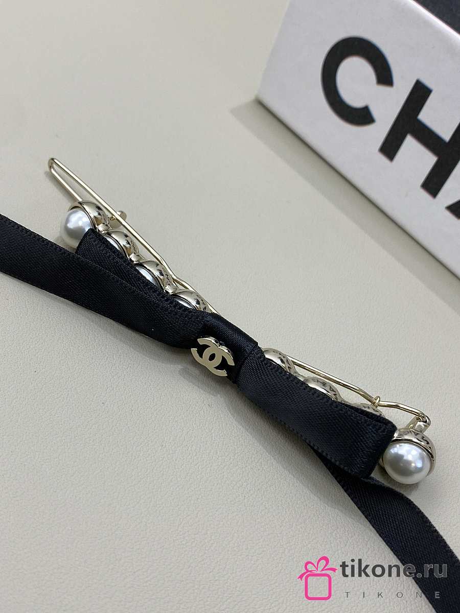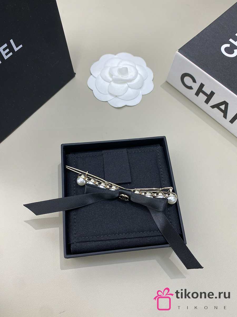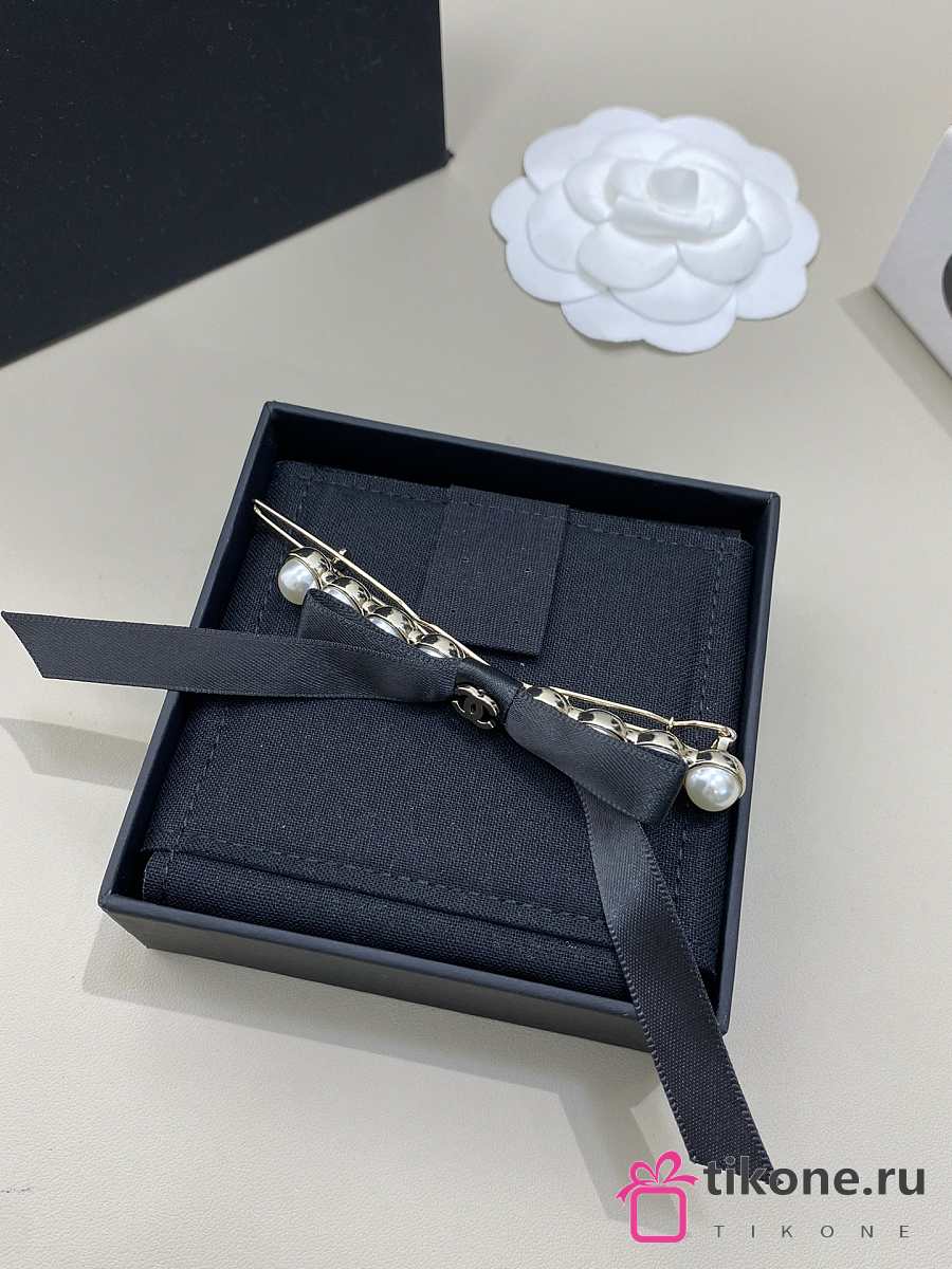 Chanel Bow Hair Clips Faux Pearl Metal & Satin Pearl White Gold & Black