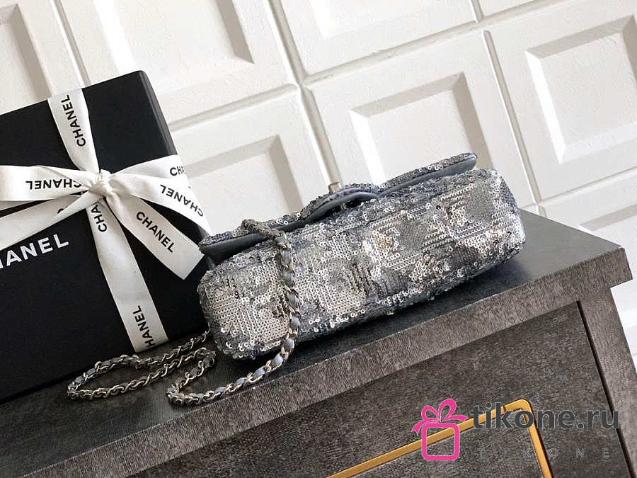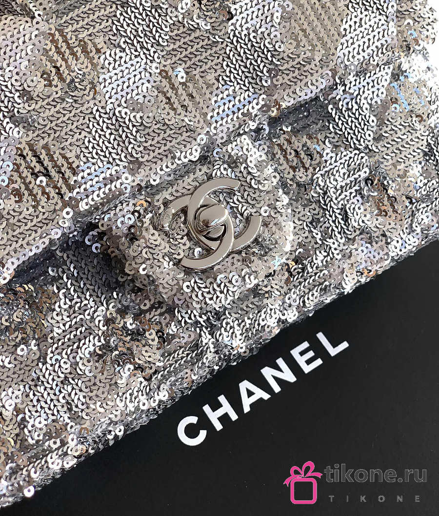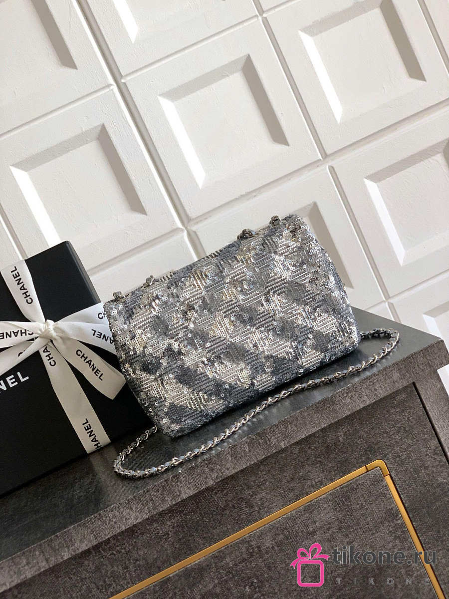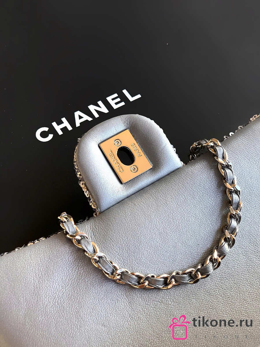 Chanel Evening Bag Quilted Sequins & Silver Tone Metal Silver - 20x10x7cm