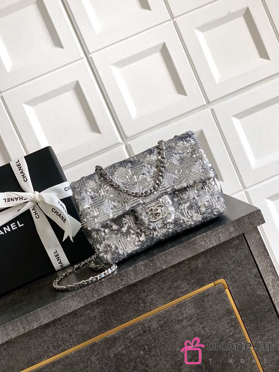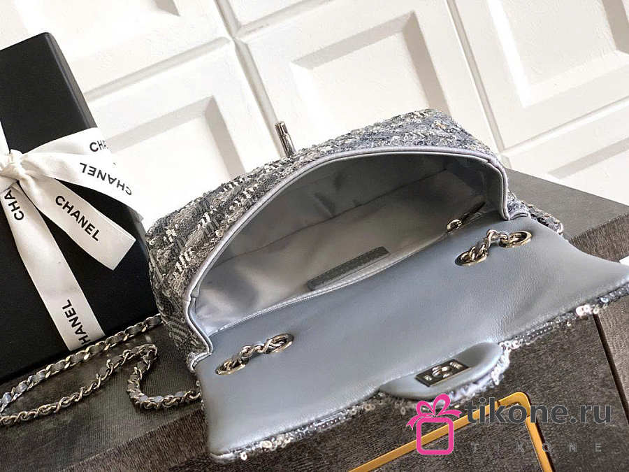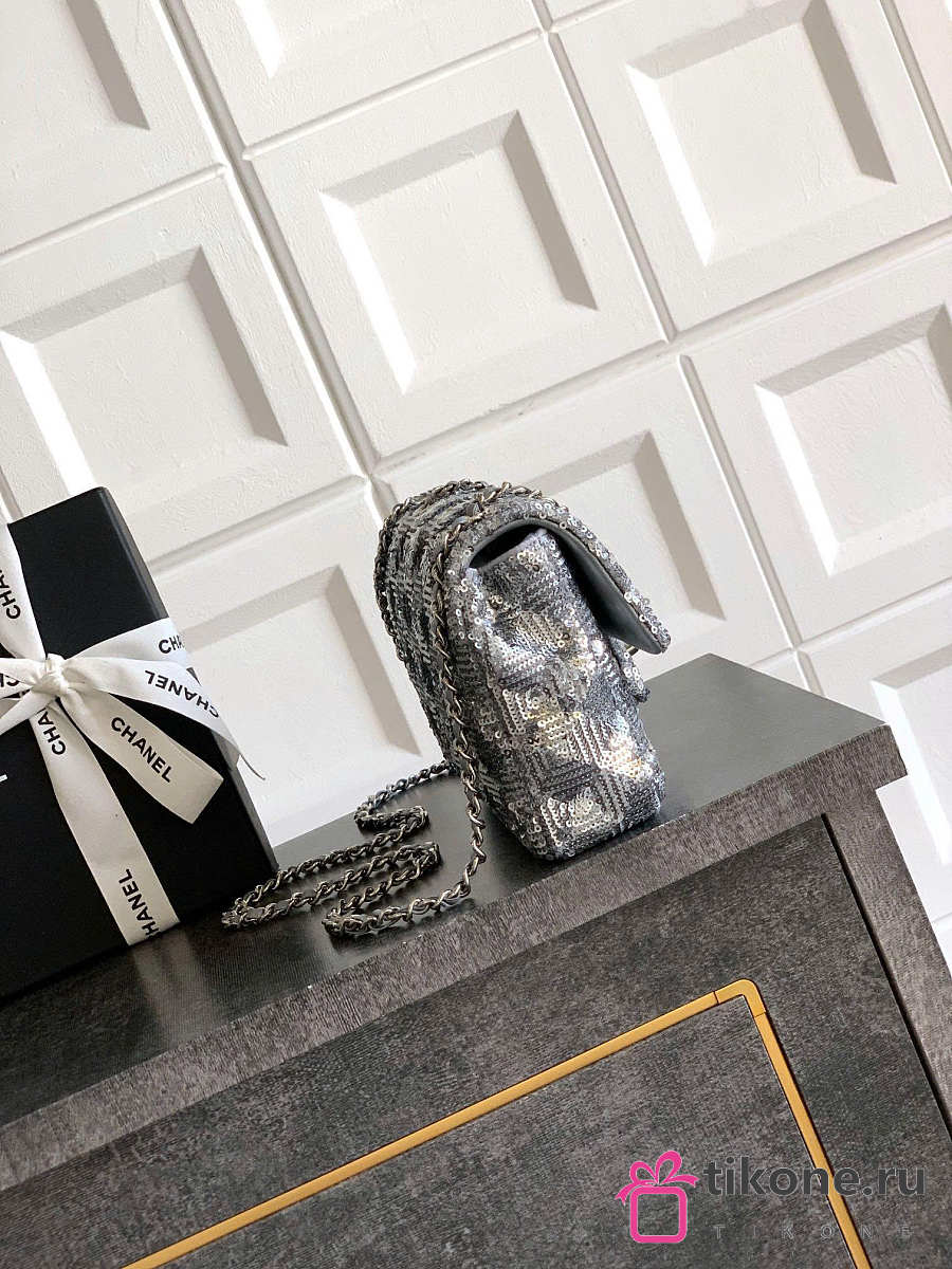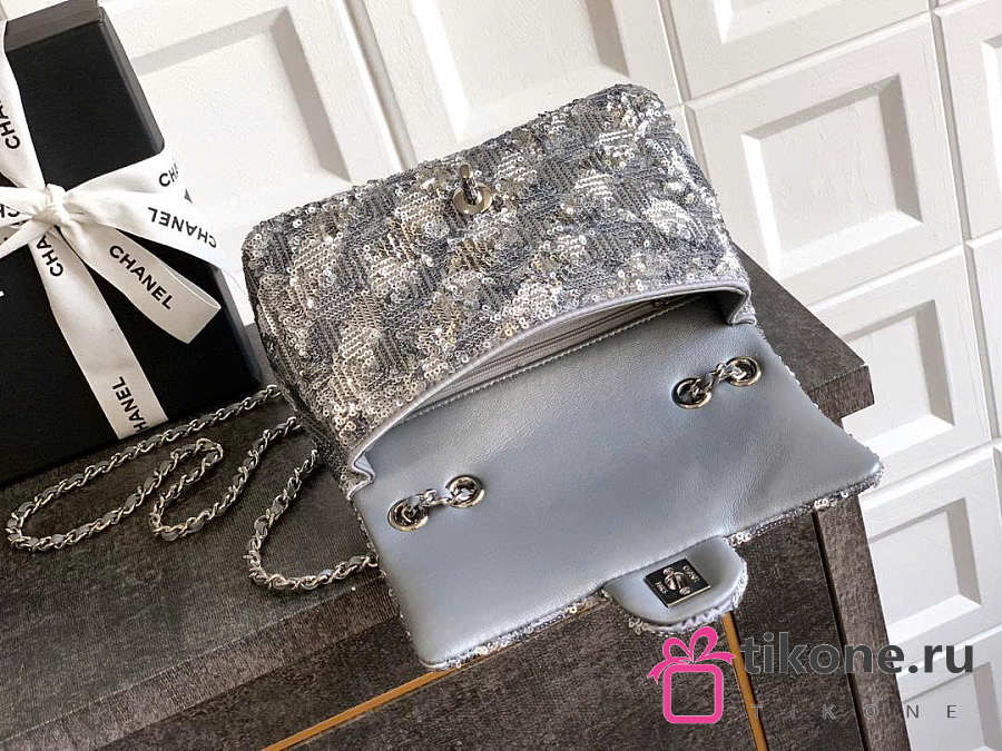 Chanel Evening Bag Quilted Sequins & Silver Tone Metal Silver - 20x10x7cm