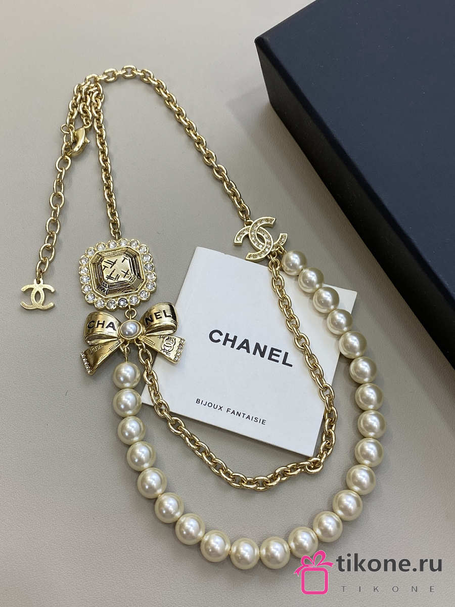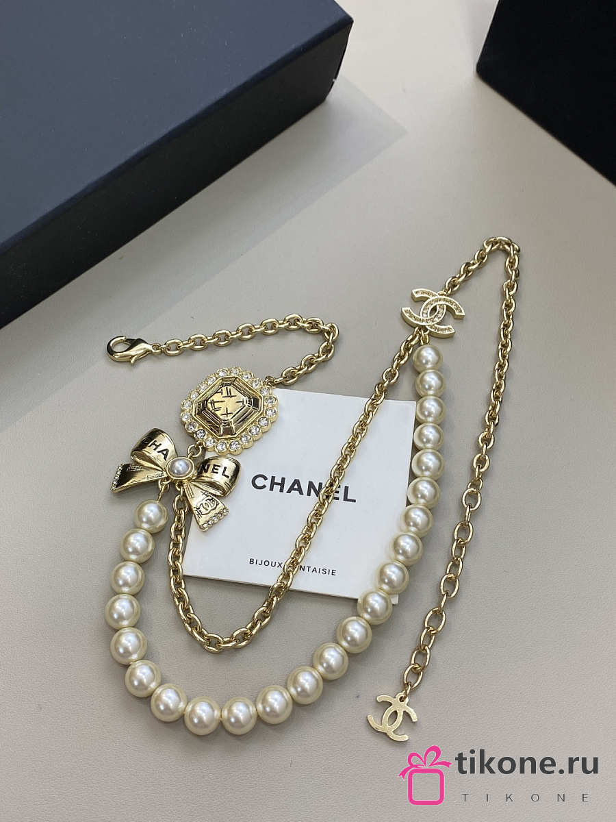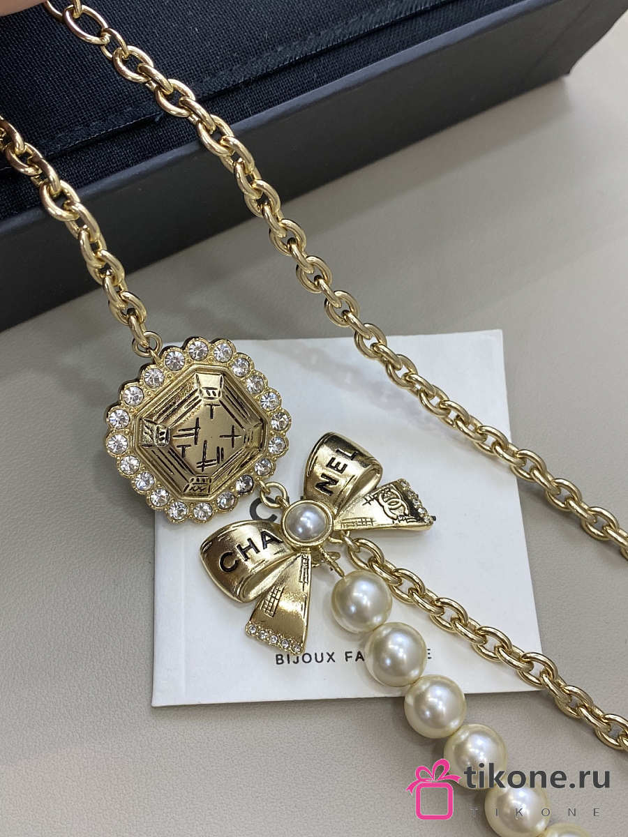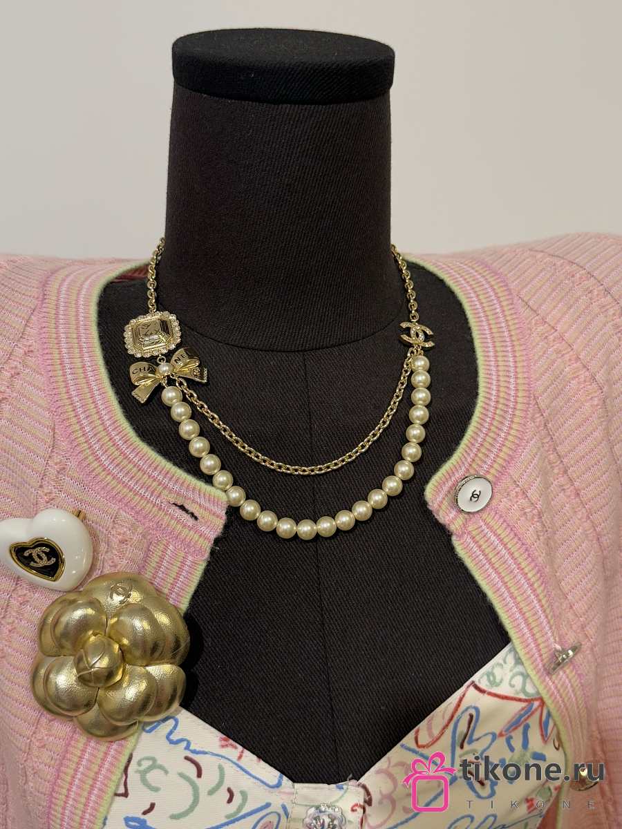 Chanel Gold C-shaped Diamond Necklace Pearl Lace Two Chains