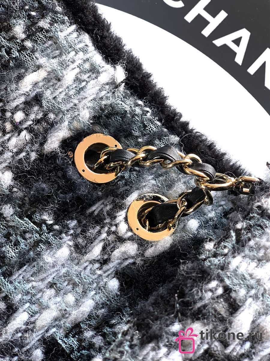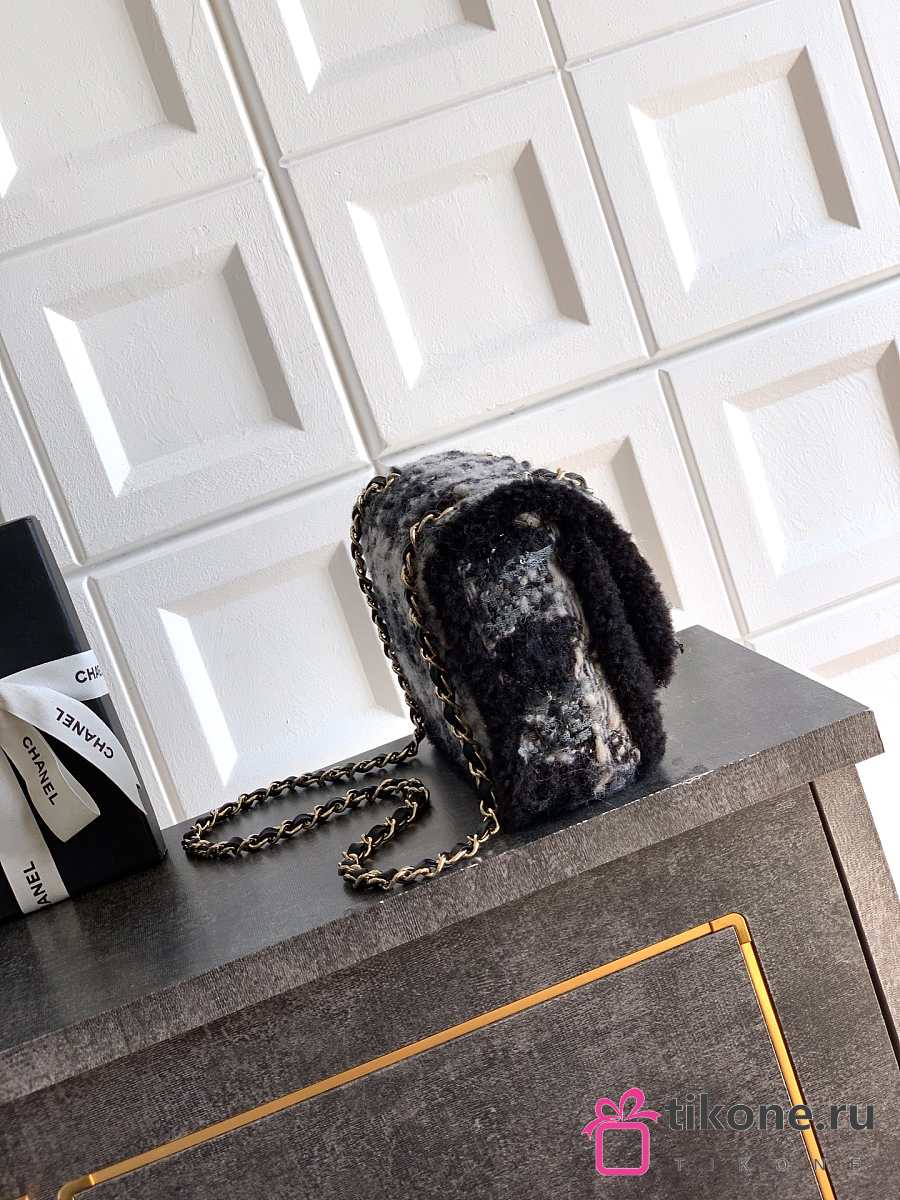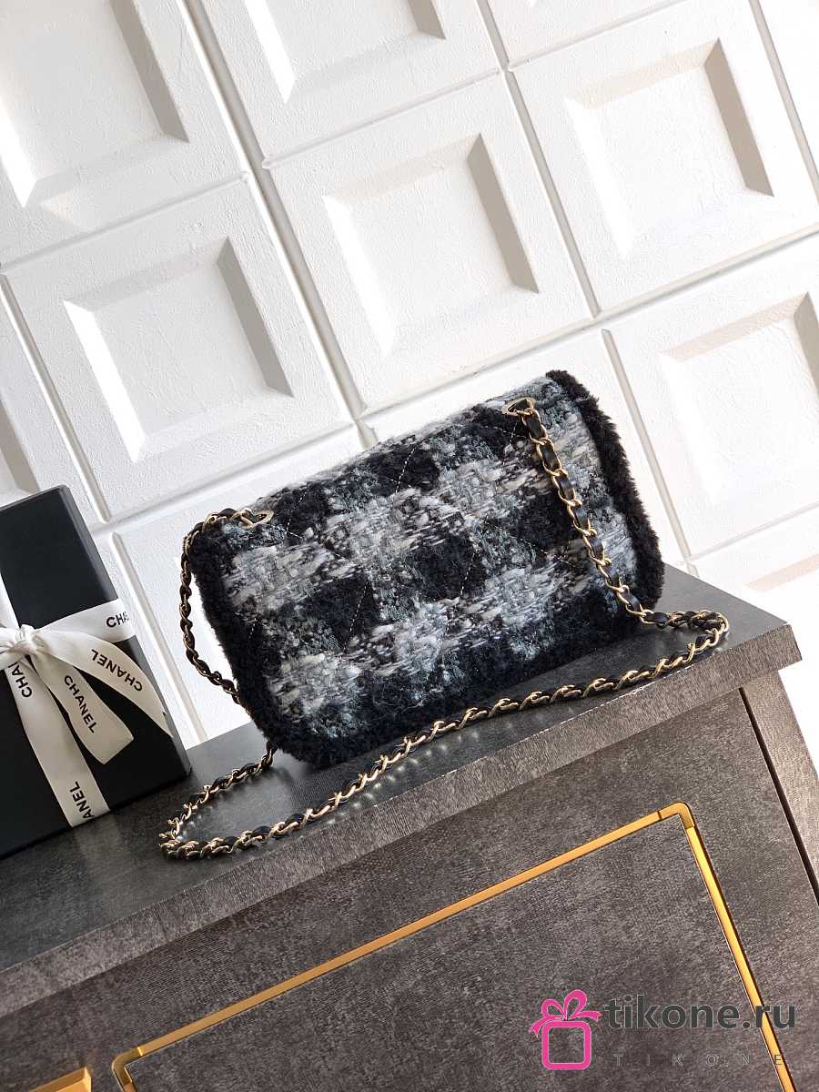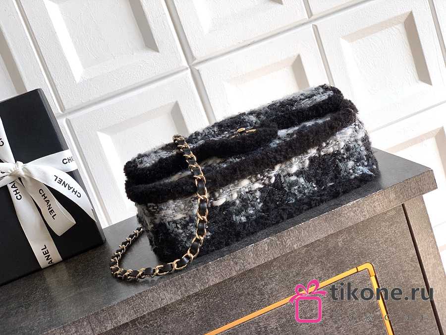 Chanel Large Flap Bag Tweed Shearling Lambskin & Gold Tone Metal Black & Grey - 26.5x16.5x9cm