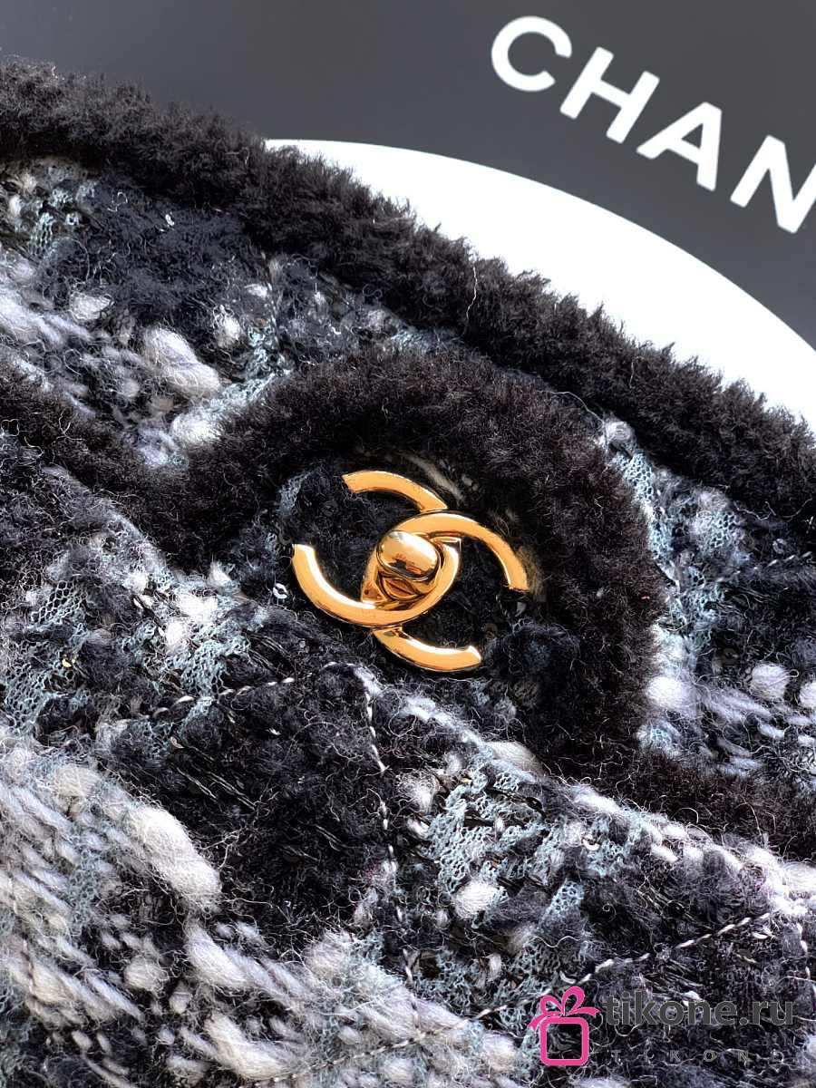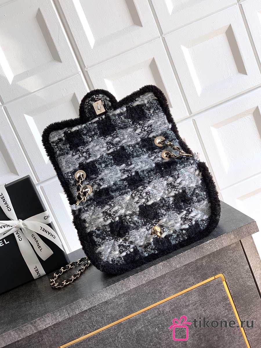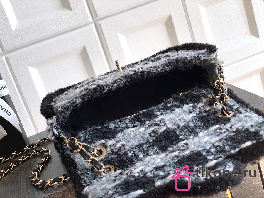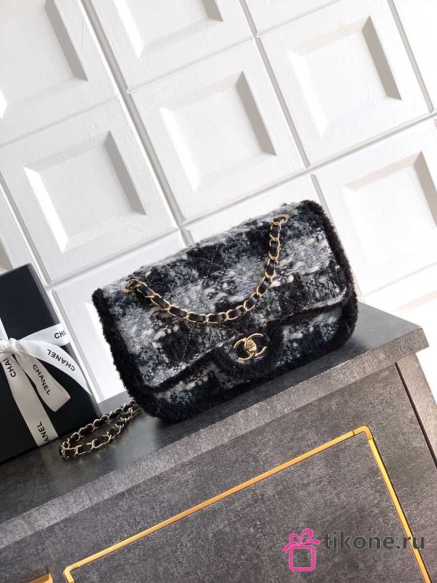 Chanel Large Flap Bag Tweed Shearling Lambskin & Gold Tone Metal Black & Grey - 26.5x16.5x9cm