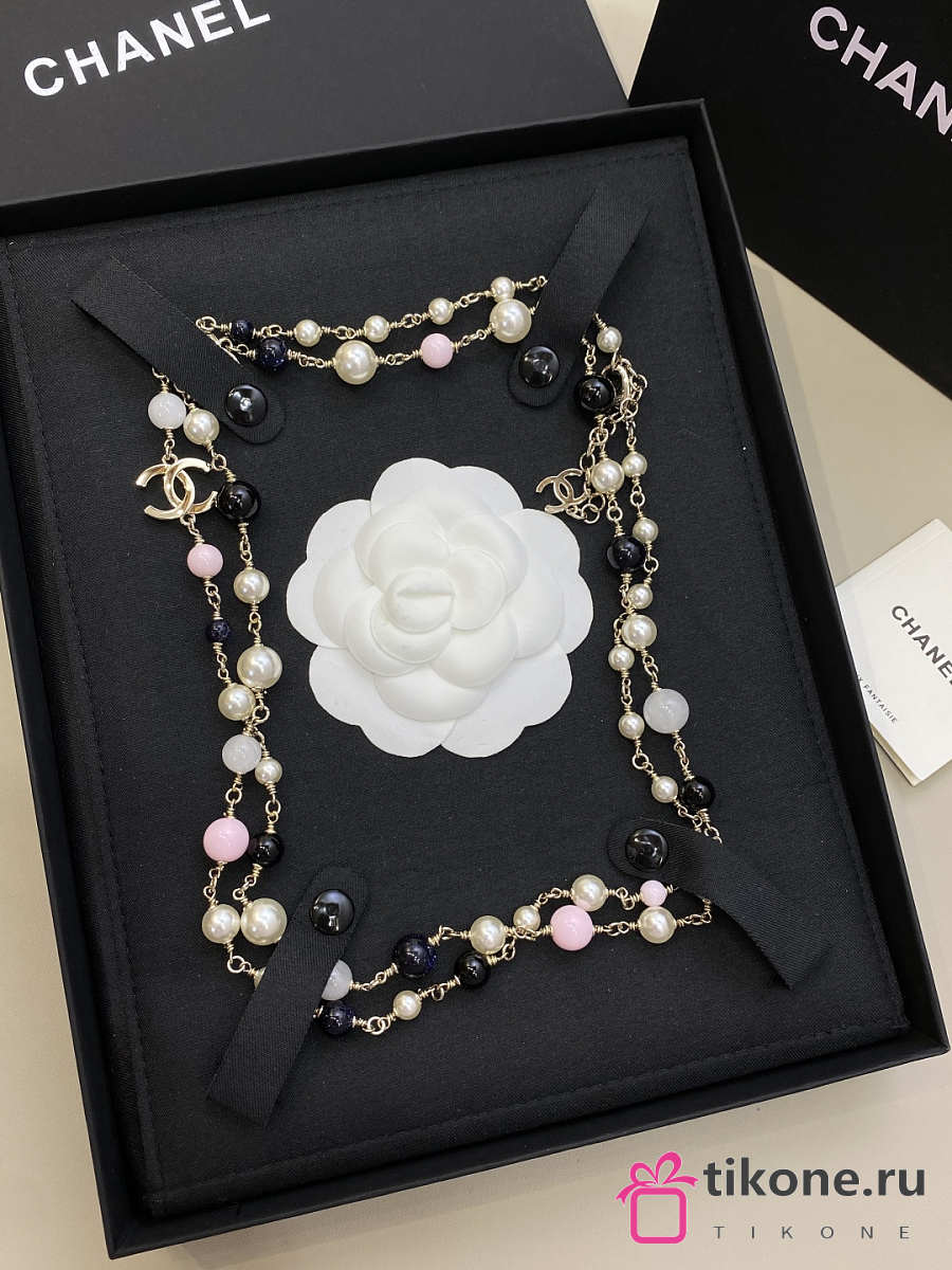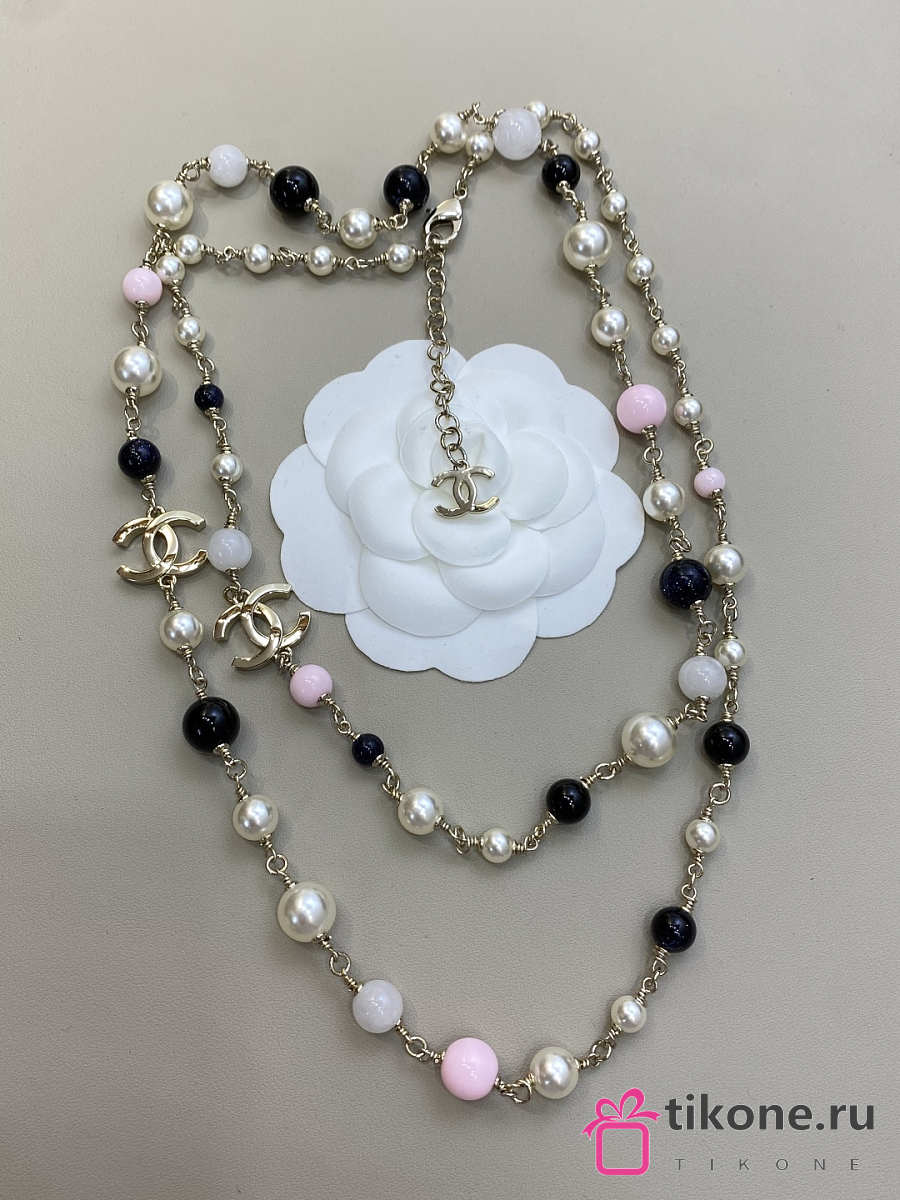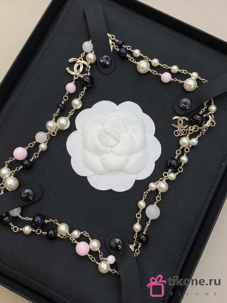 Chanel Long Necklace Metal & Glass Pearls Gold Black Light Pink & Pearly White