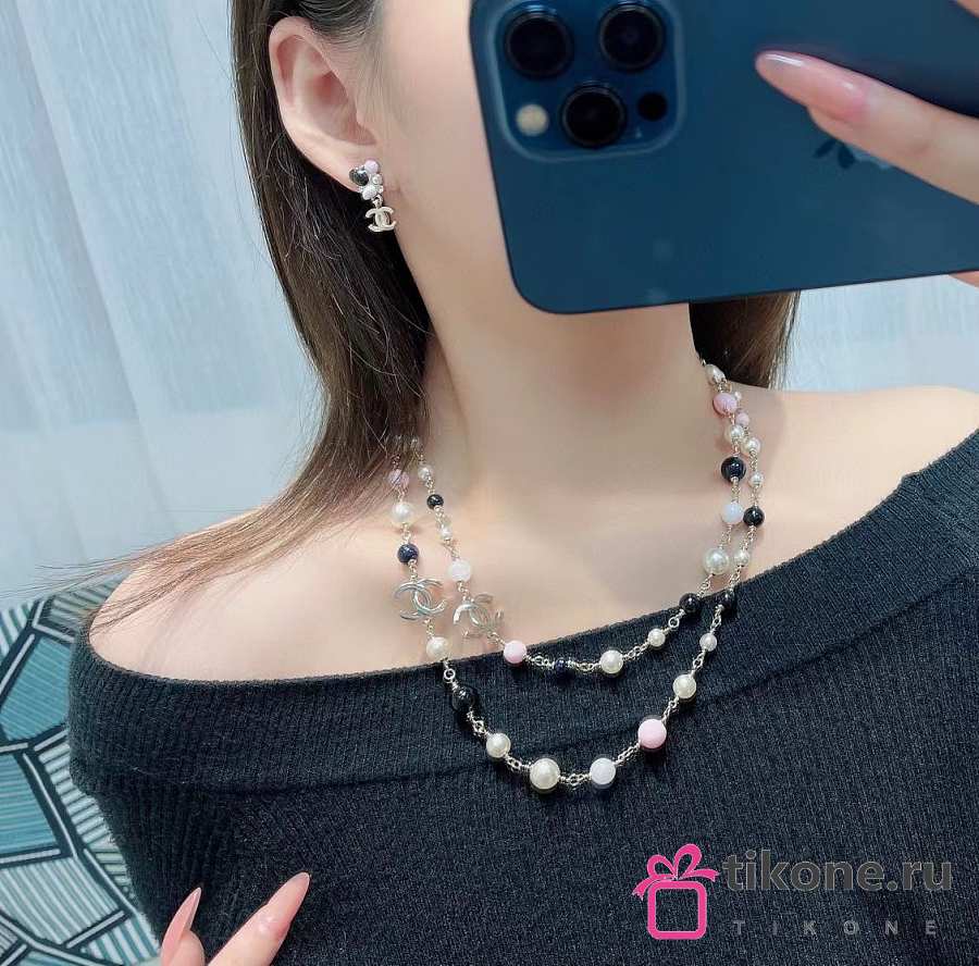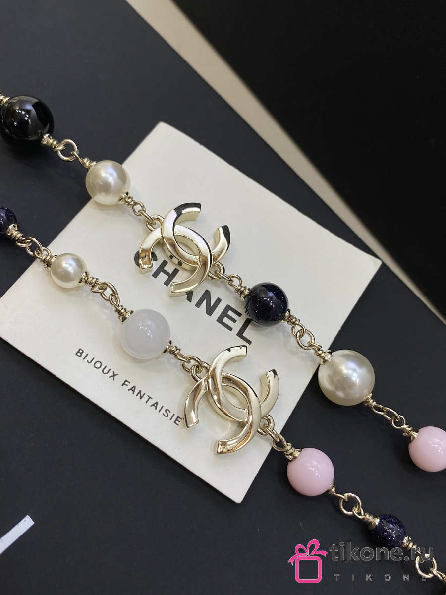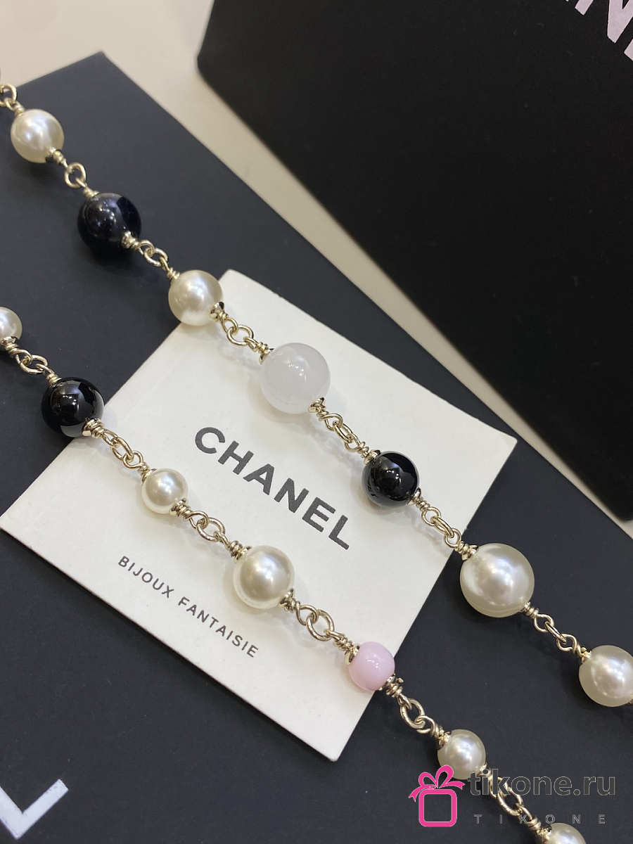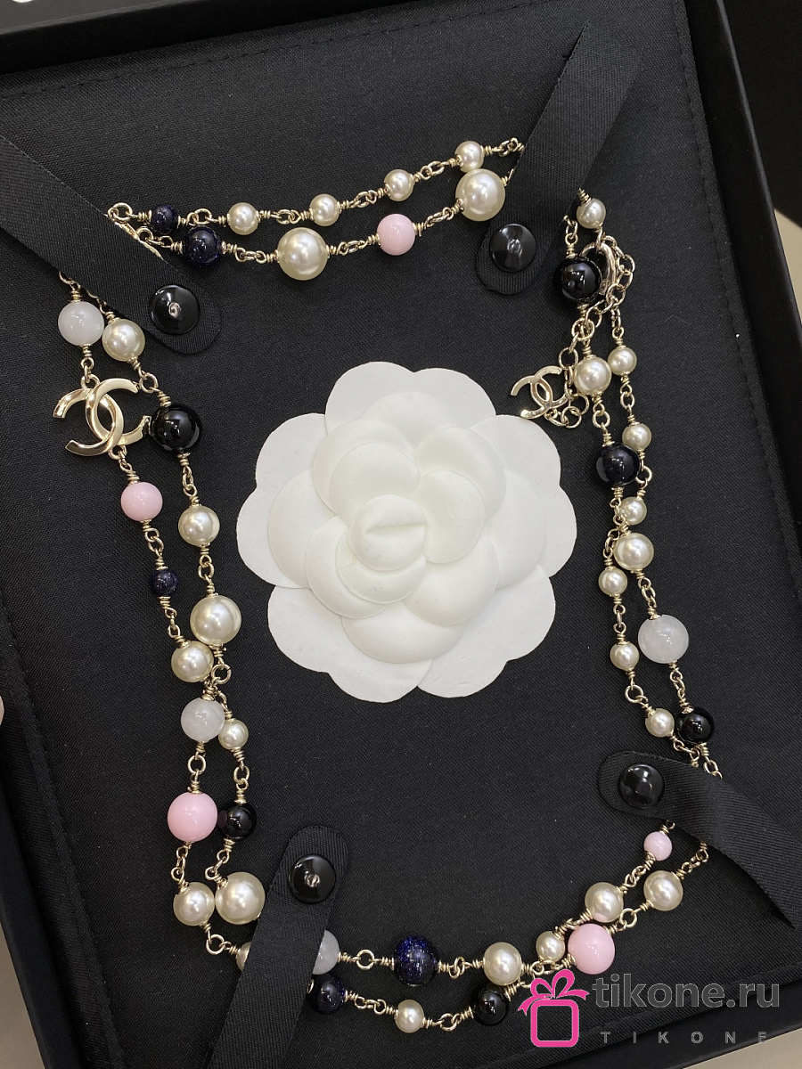 Chanel Long Necklace Metal & Glass Pearls Gold Black Light Pink & Pearly White