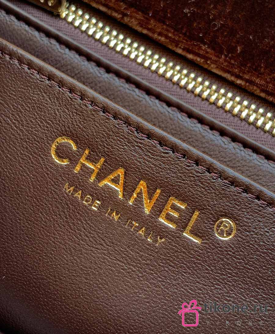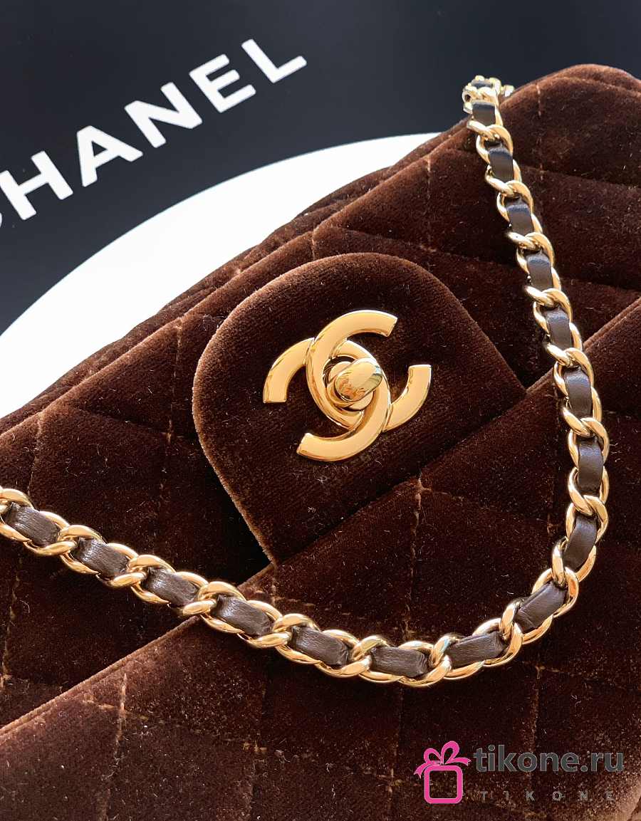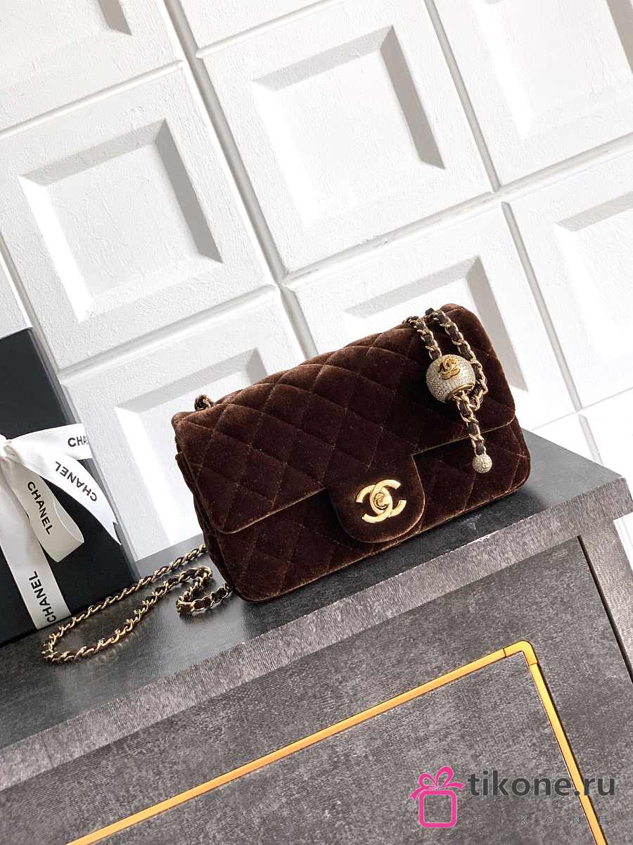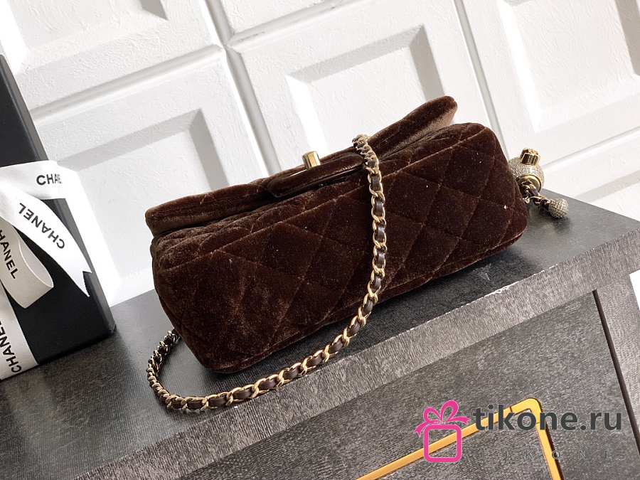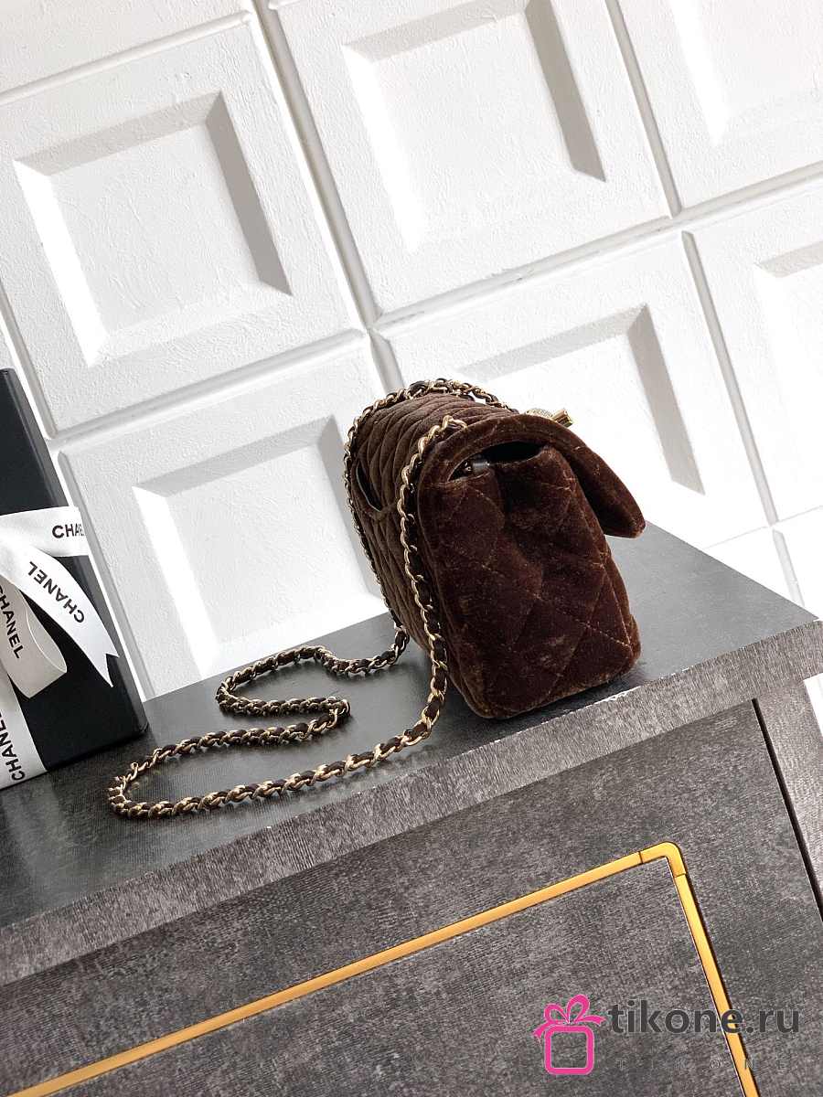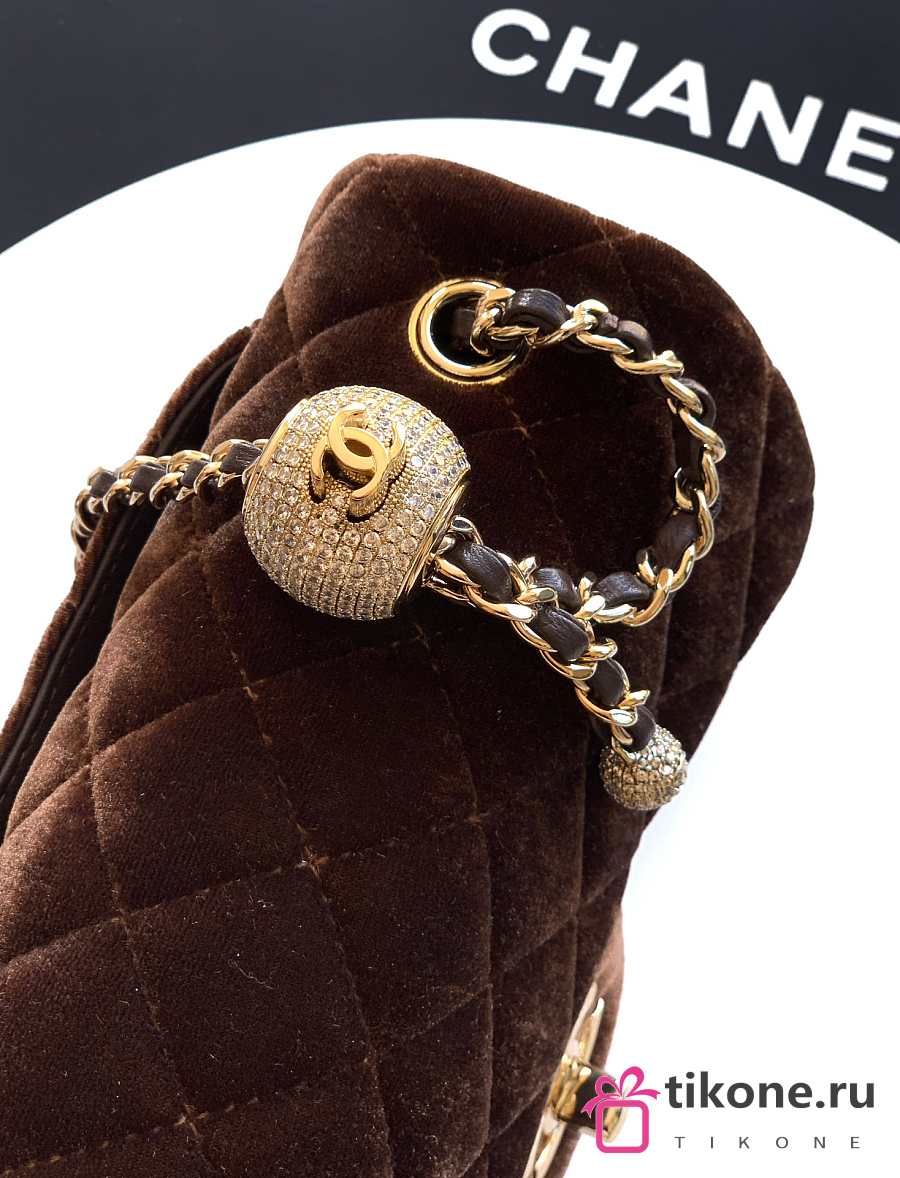 Chanel Mini Flap Bag Velvet Diamanté & Gold Tone Metal Dark Brown - 20x13x7cm