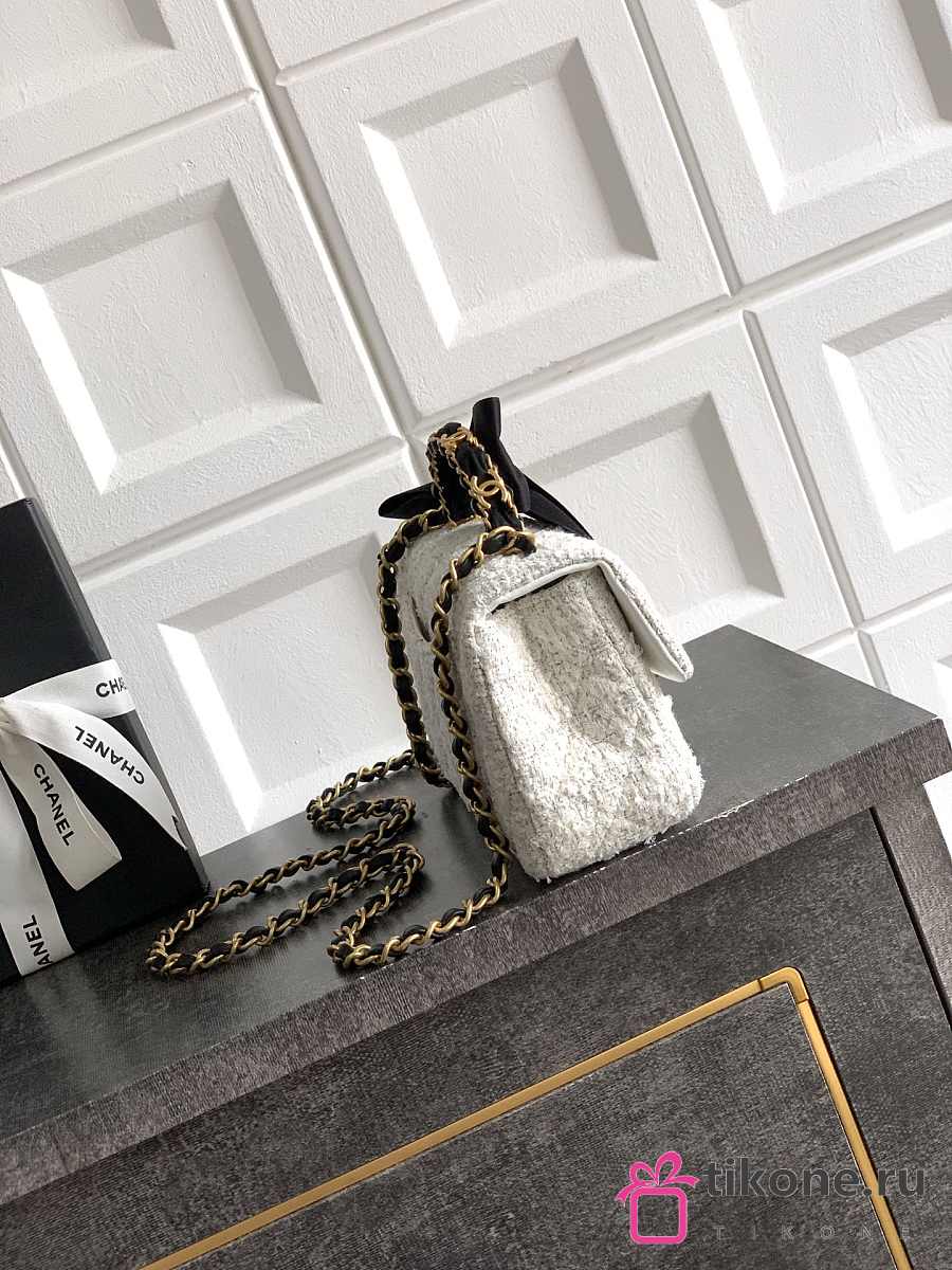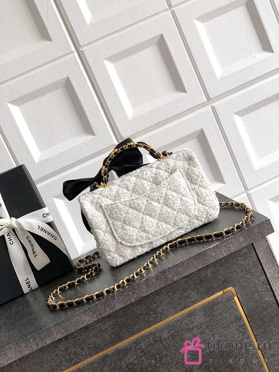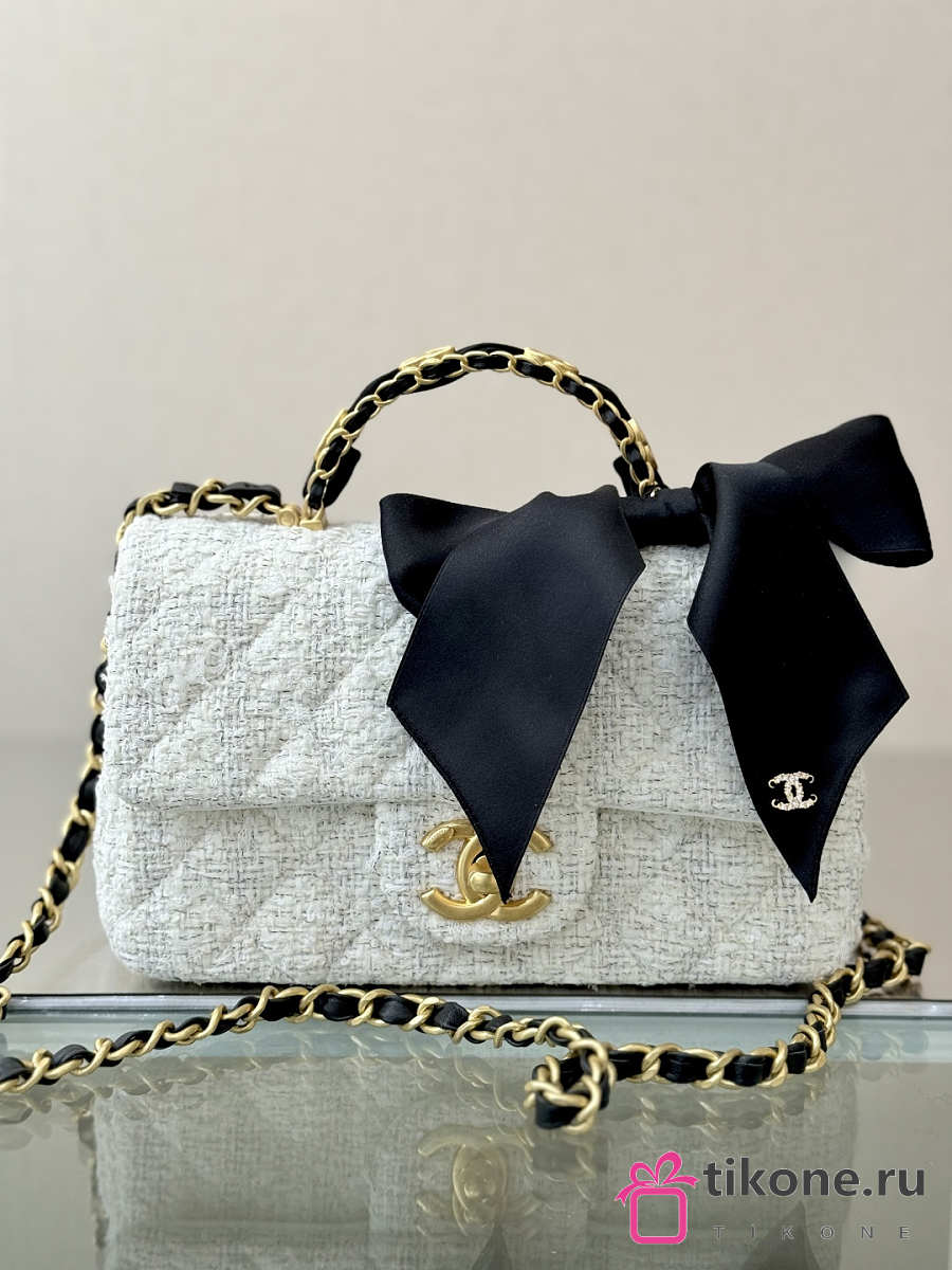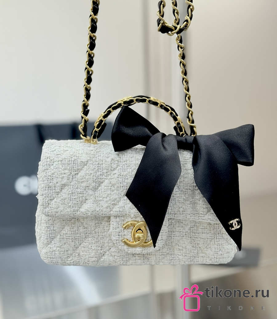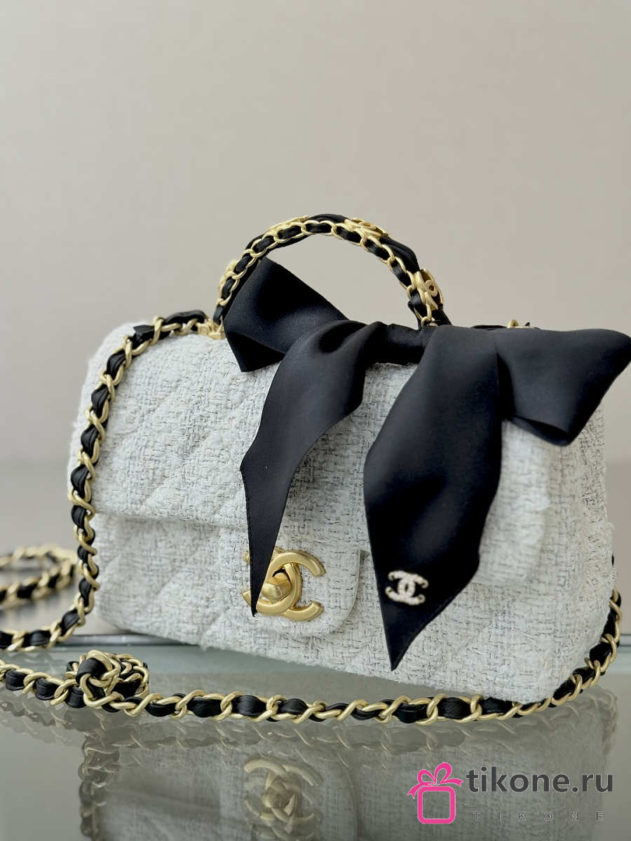 Chanel Mini Flap Bag with Top Handle Tweed, Silk & Gold Tone Metal White & Black - 20x13x6cm