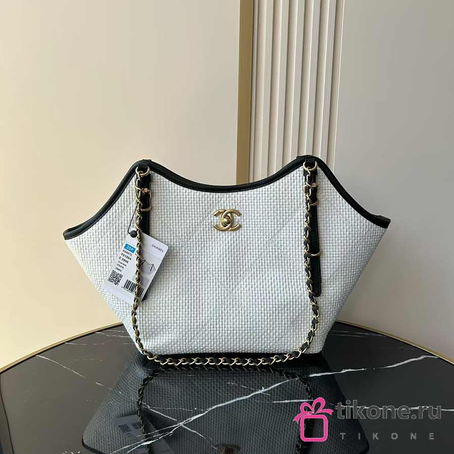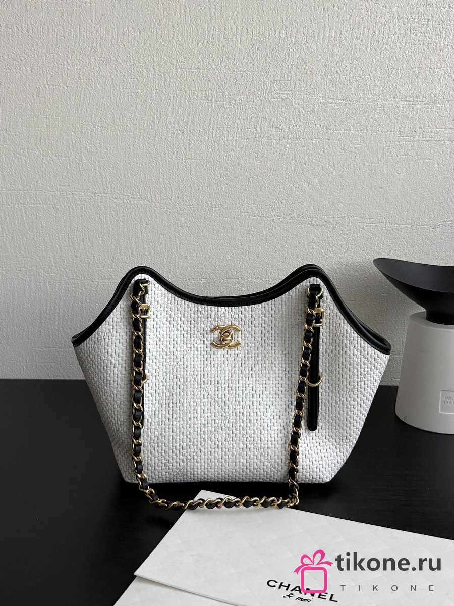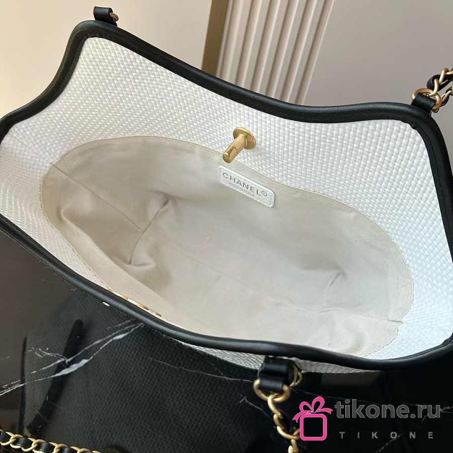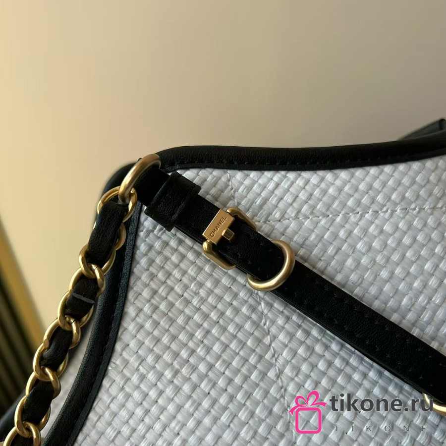 Chanel Small Shopping Bag Braided Raffia Calfskin & Gold Tone Metal White & Black - 20x28x7cm