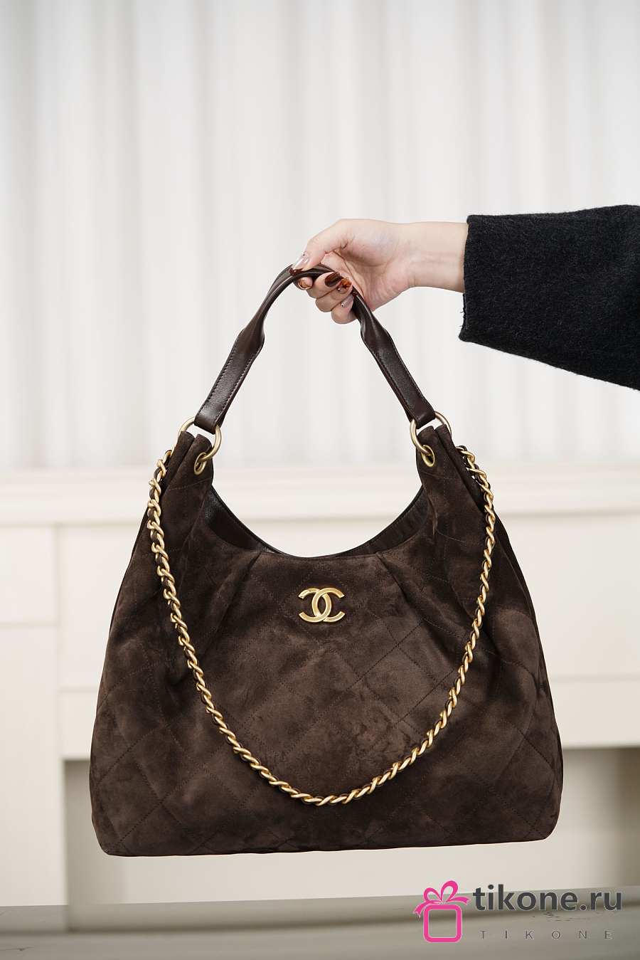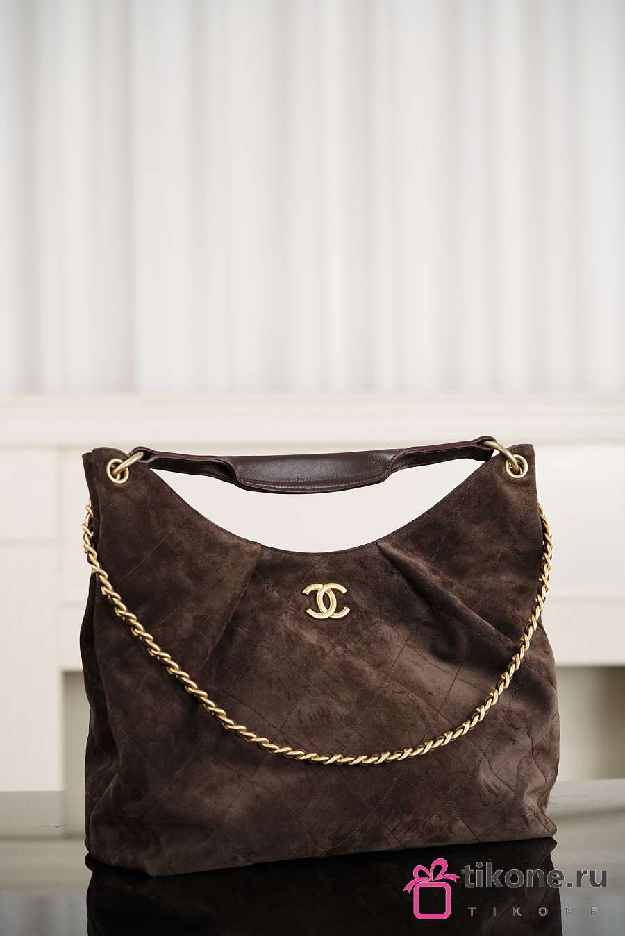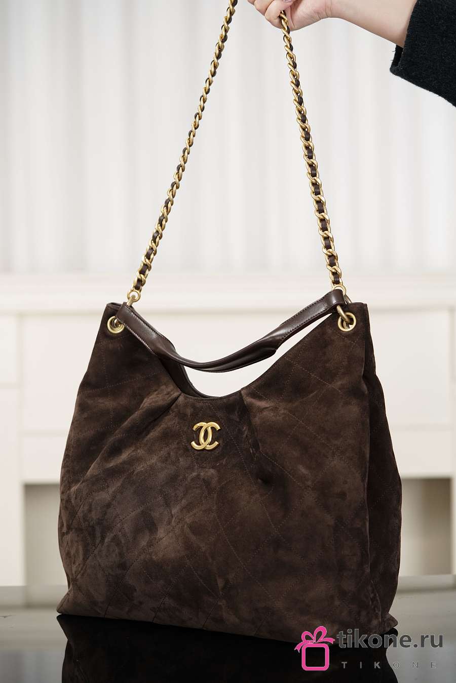 Chanhel Maxi Hobo Bag Suede Calfskin Lambskin & Gold-Tone Metal Dark Brown - 38x35x14cm