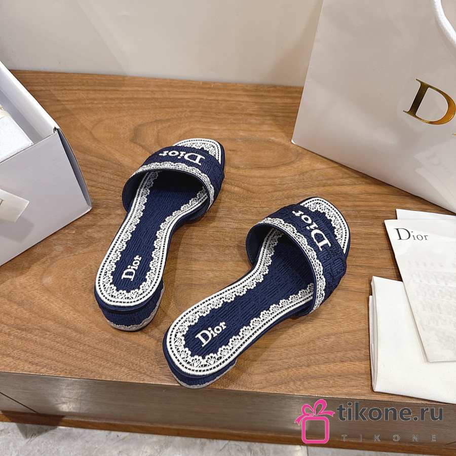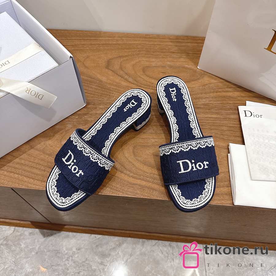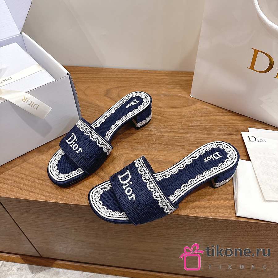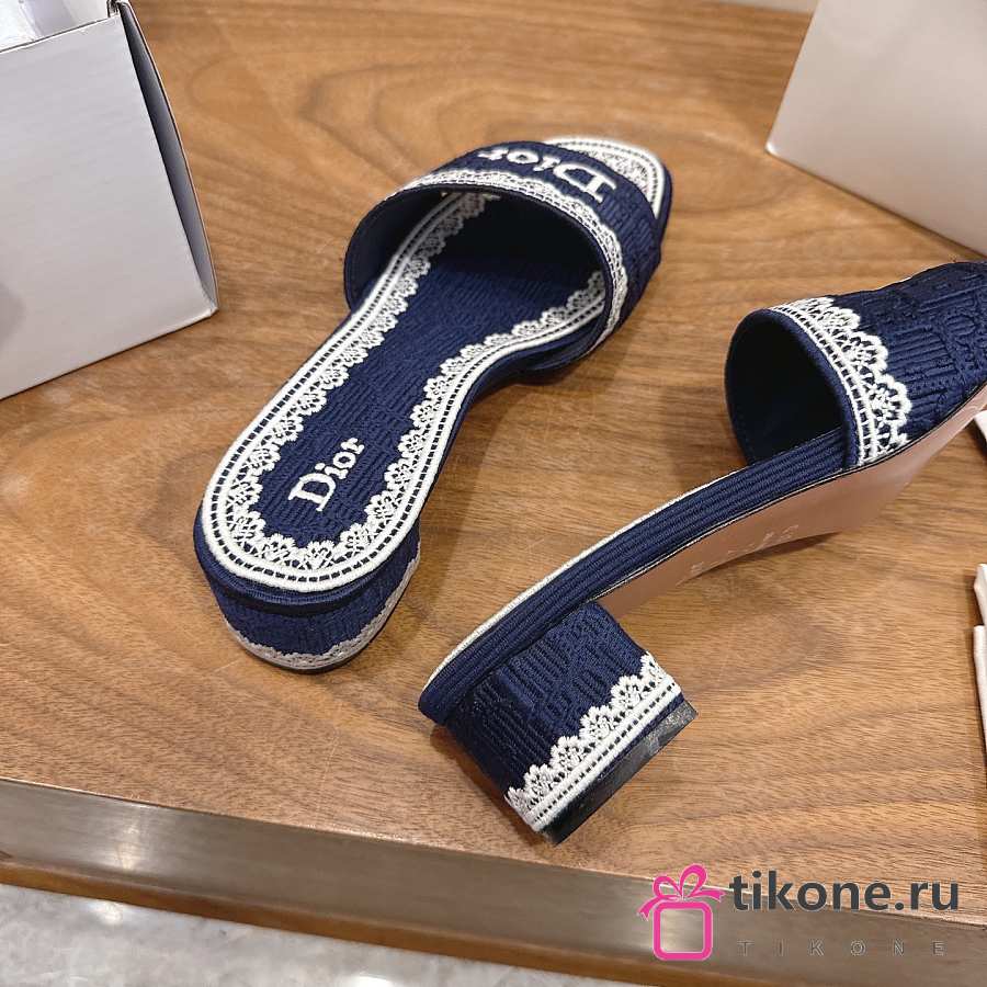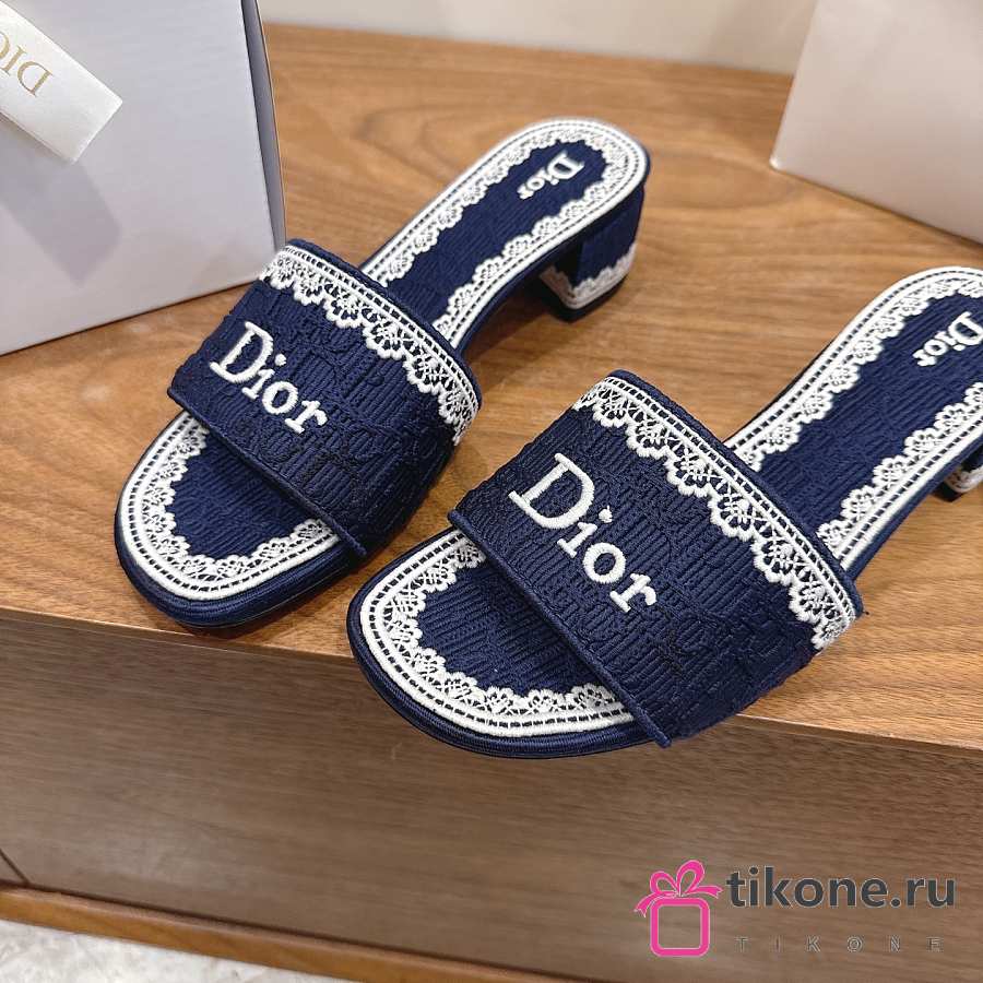 Dior Dentelle Heeled Slide Blue Dior Oblique Embroidered Cotton and White Lace 3.5cm