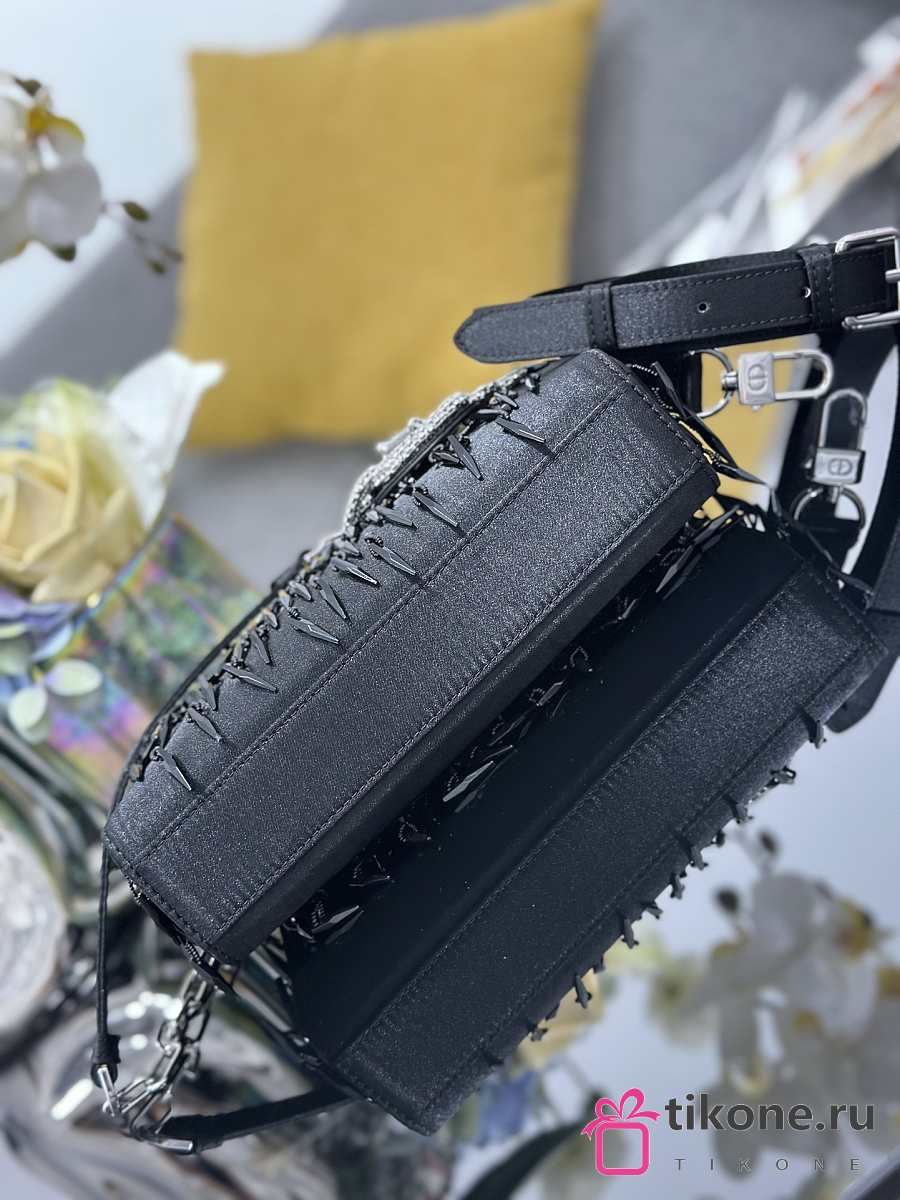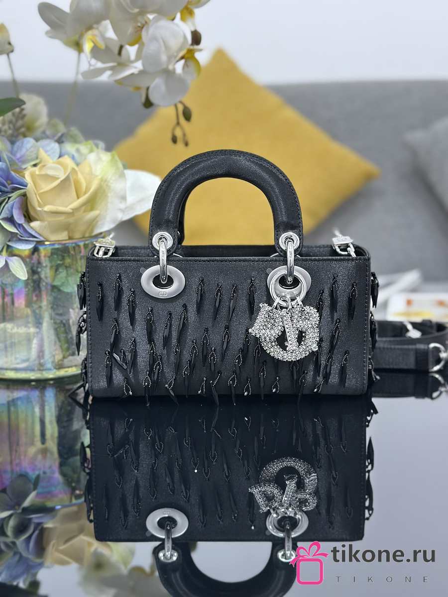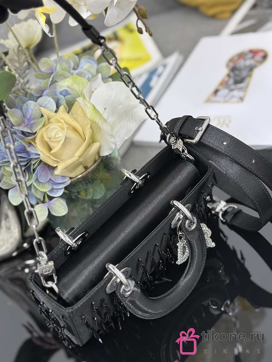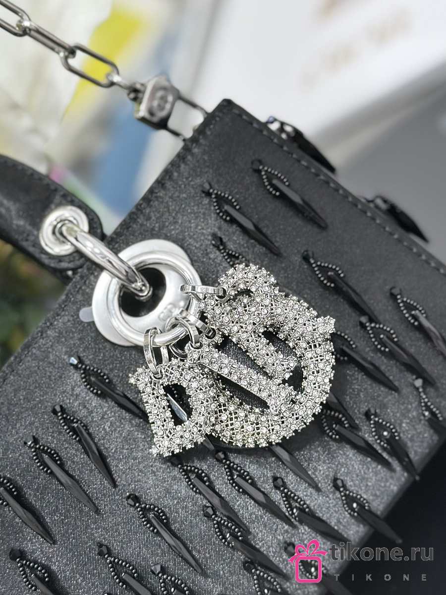 Dior Lady D-Joy Black Satin with Beaded Embellishments & Rhinestone Charms - 22x12x6