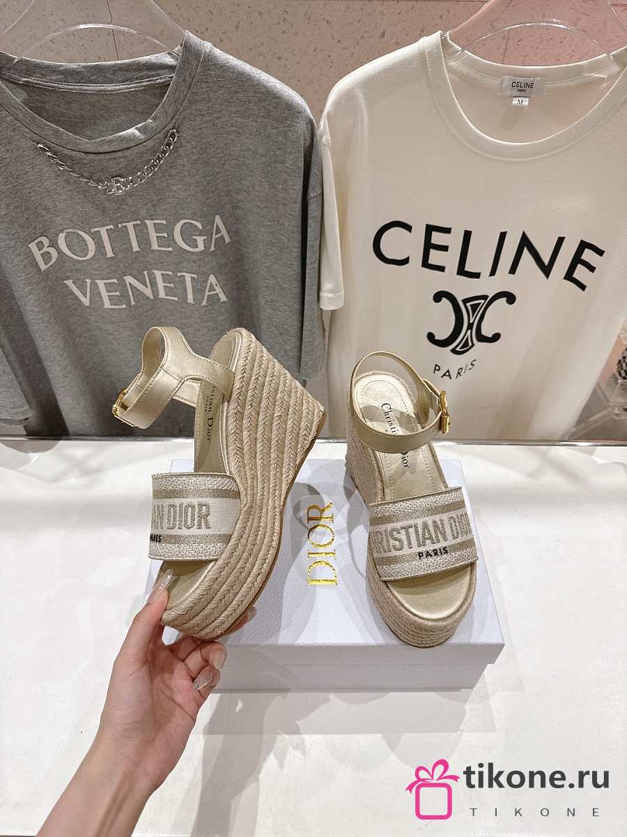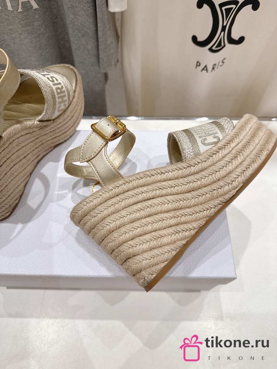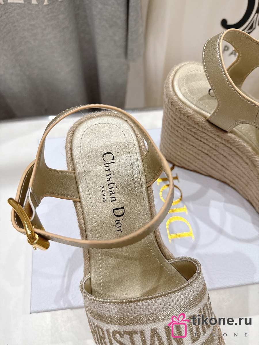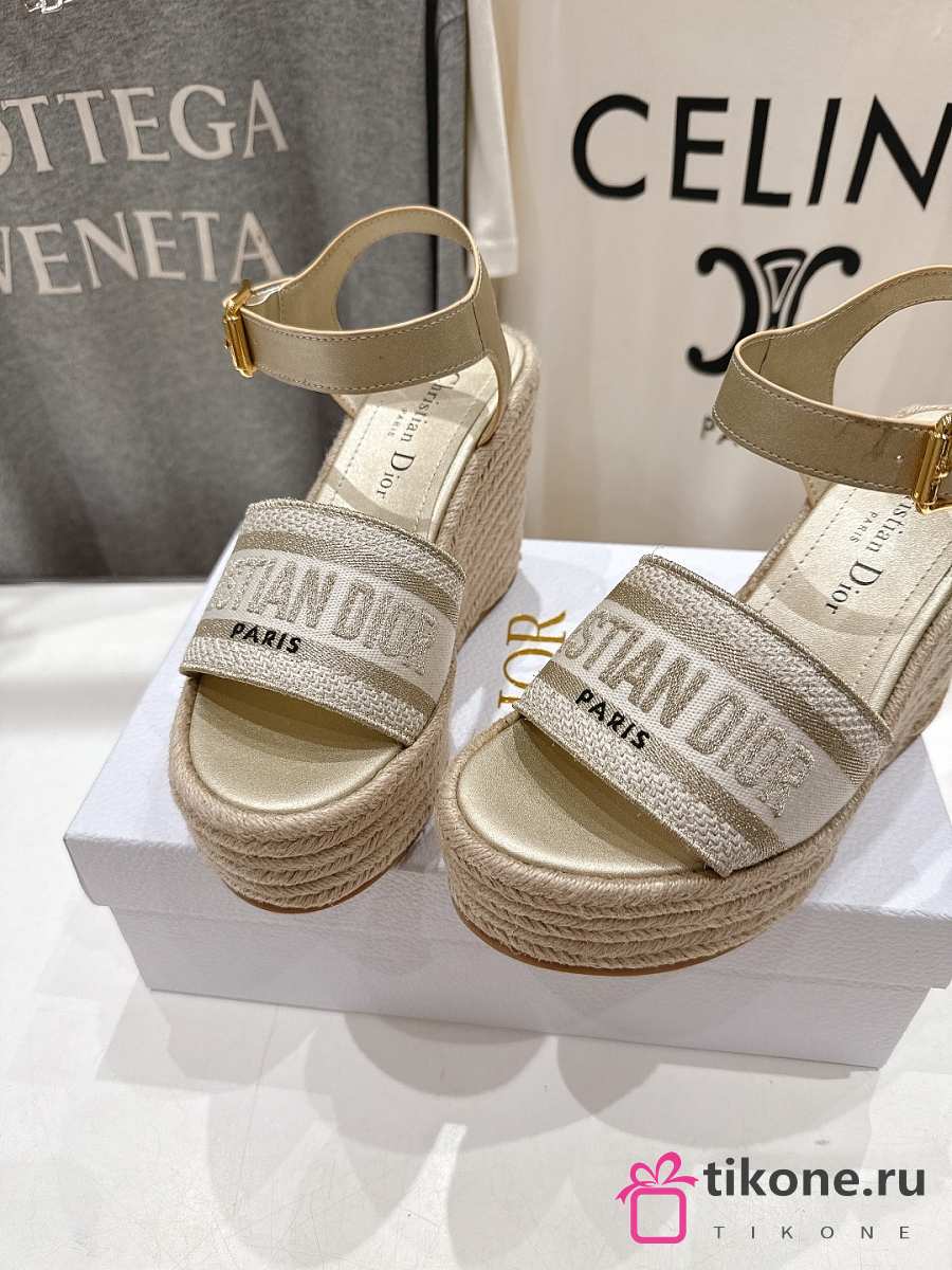 Dior Or Dway Wedge Sandal Laminated Calfskin and Cotton Embroidered with Gold-Tone Metallic Thread 9.5