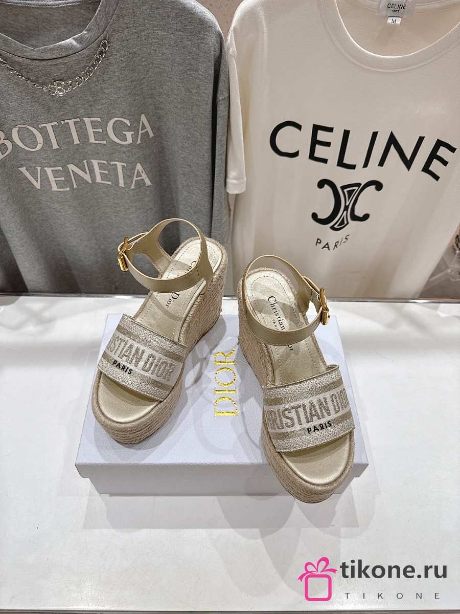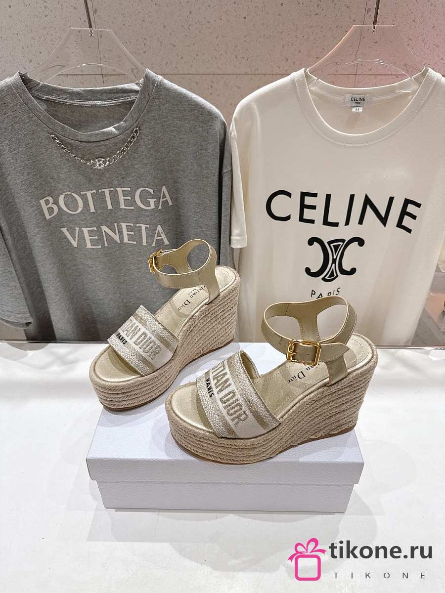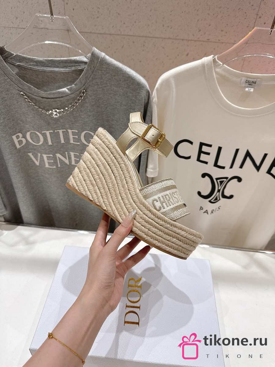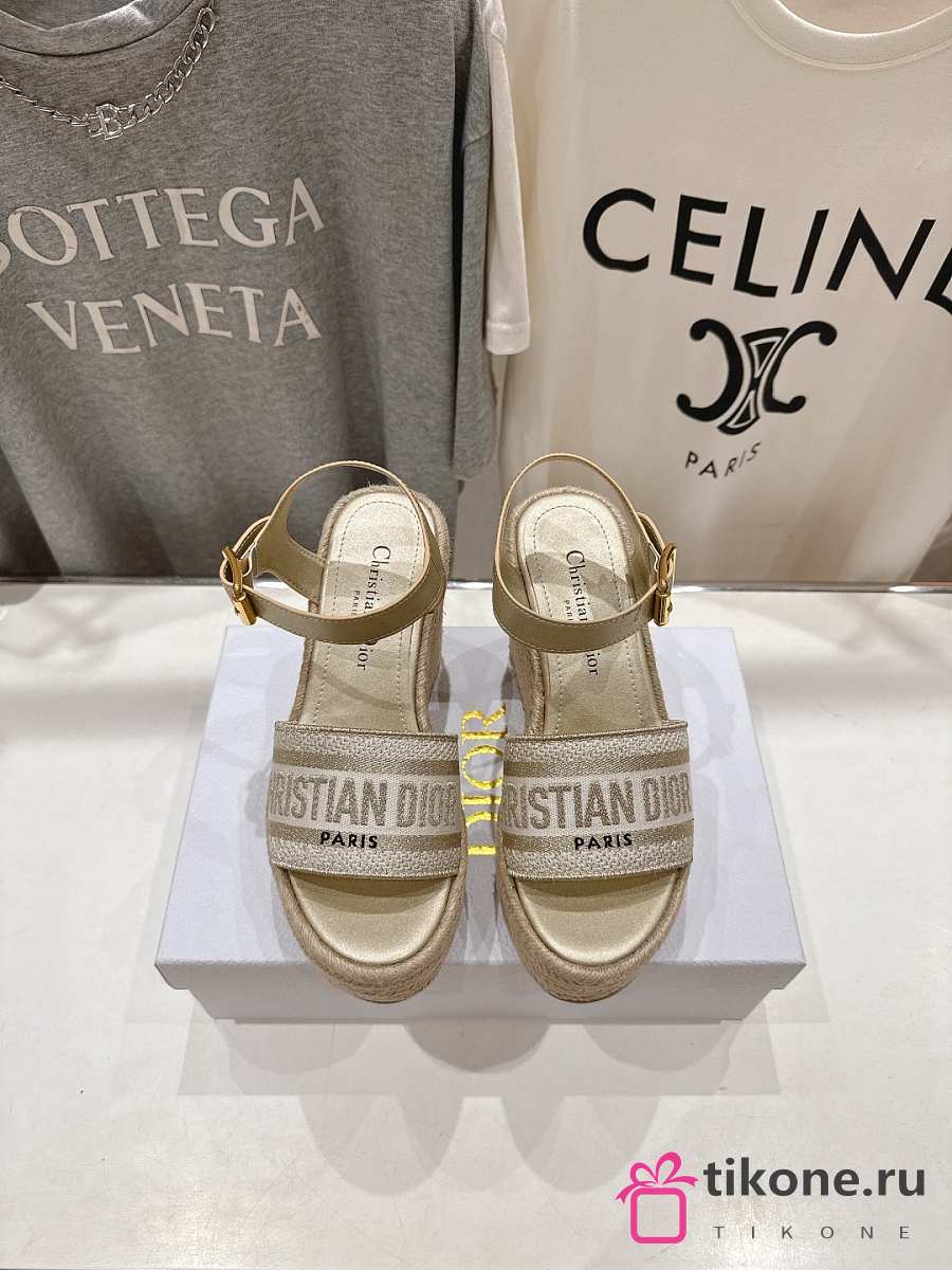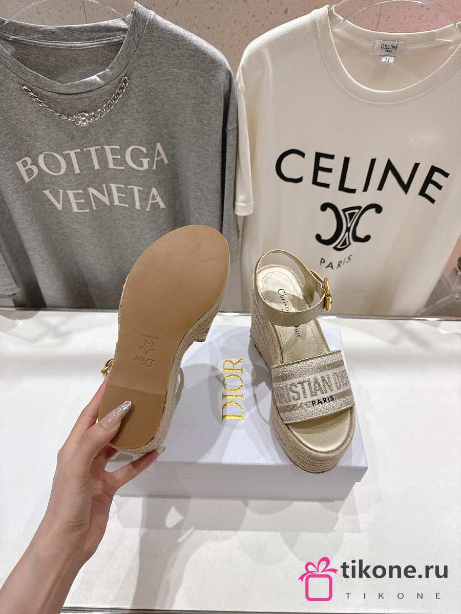 Dior Or Dway Wedge Sandal Laminated Calfskin and Cotton Embroidered with Gold-Tone Metallic Thread 9.5