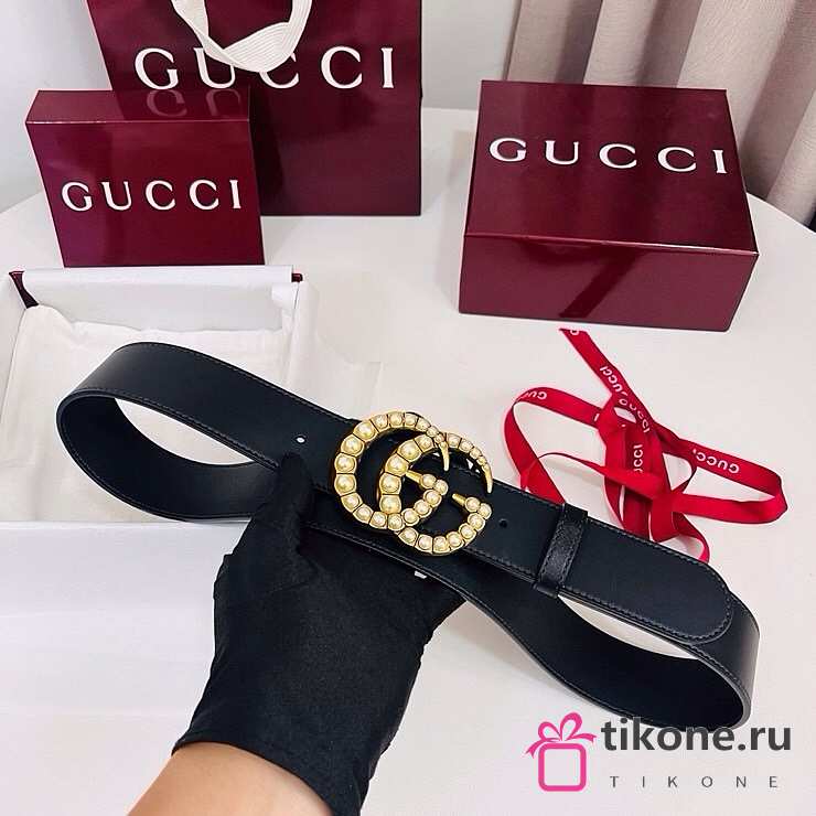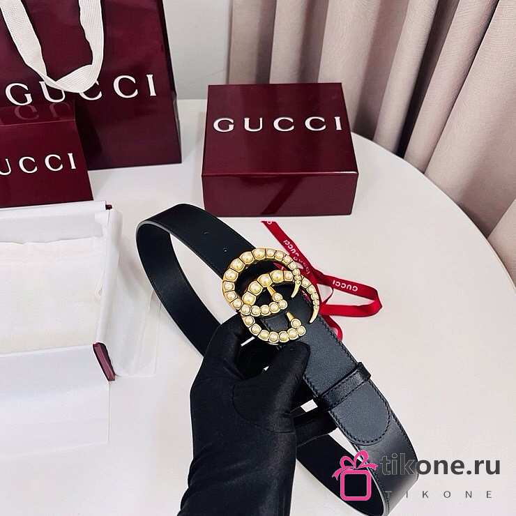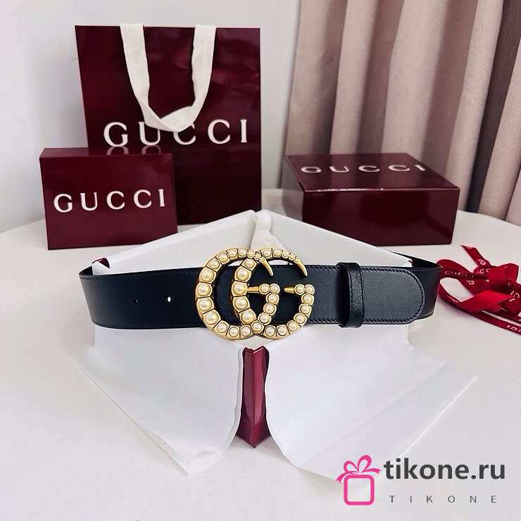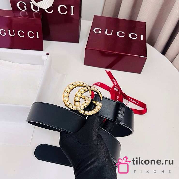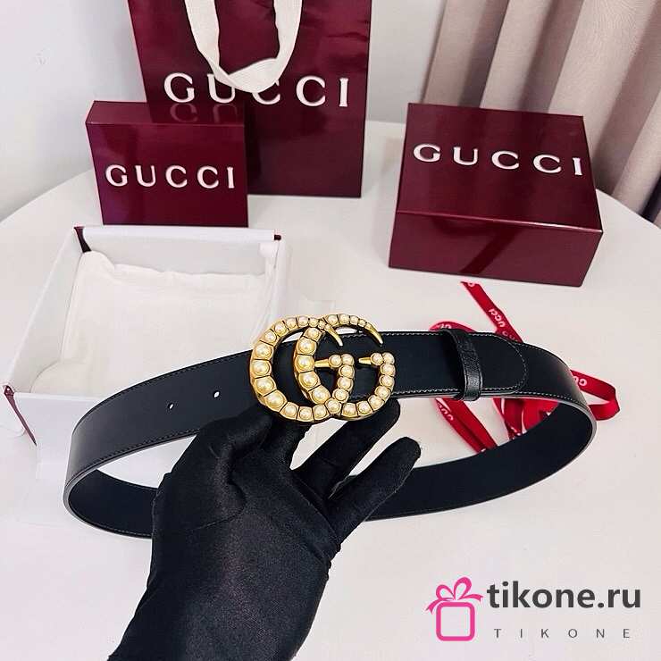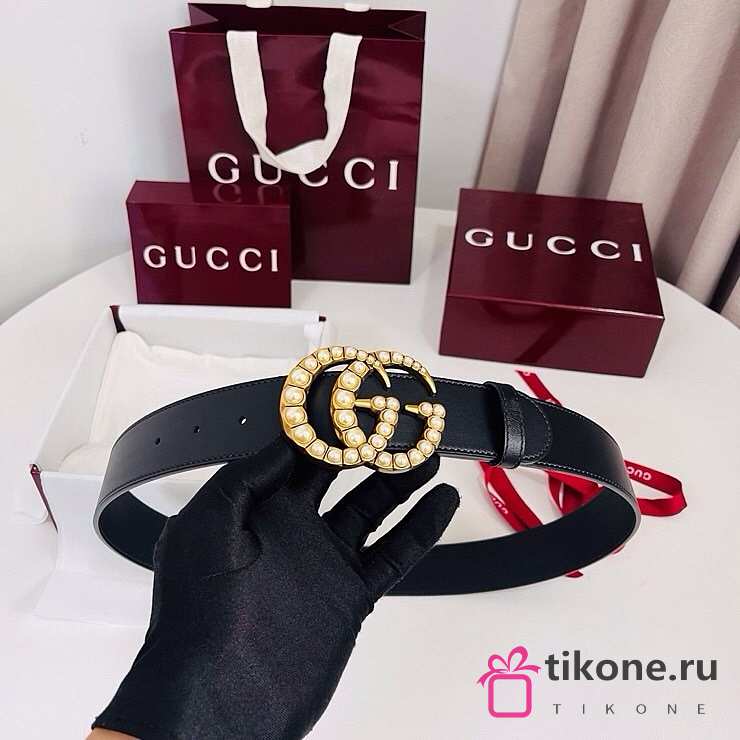 Gucci Leather Belt with Pearl Double G Buckle Black 3.8cm