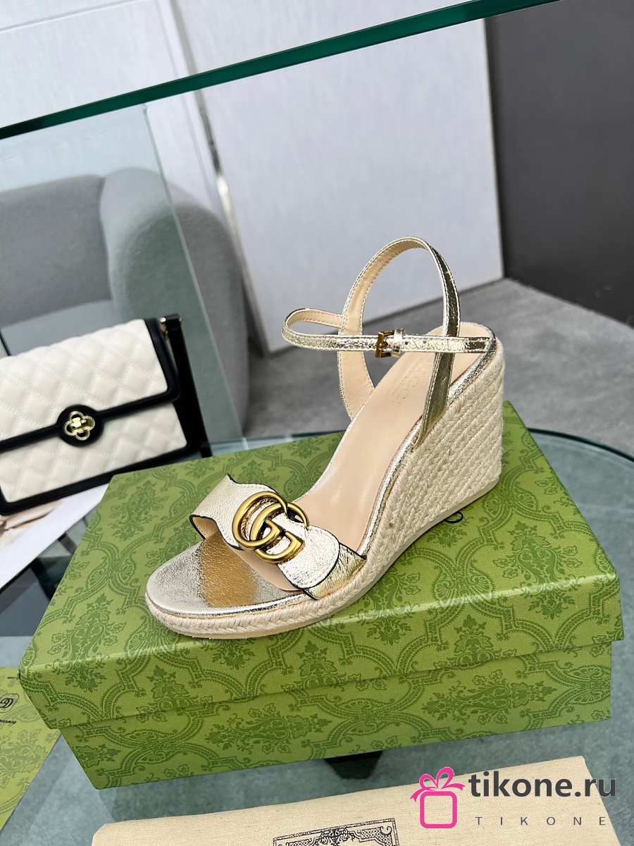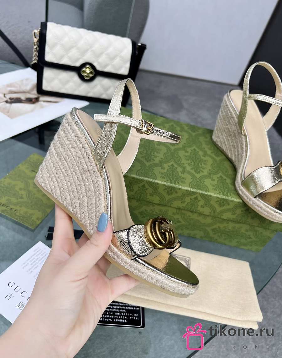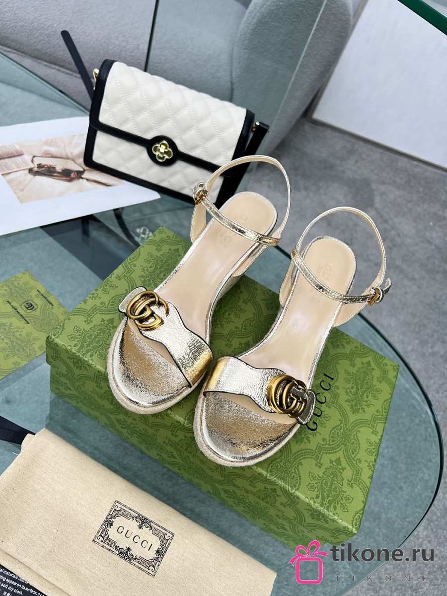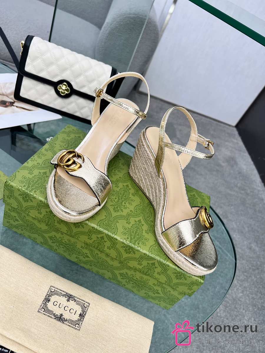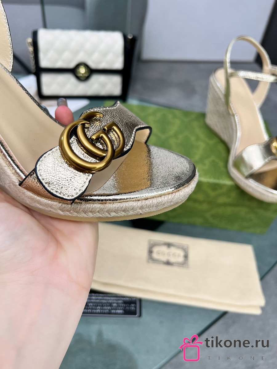 Gucci Metallic Aitana Leather GG Marmont Espadrille Wedges 85mm