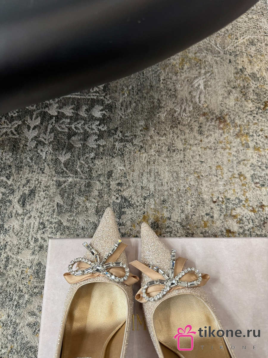 Jimmy Choo Auria 70 Light Soft Gold Caviar Glitter Fabric Pumps with Crystal Embellished Bows