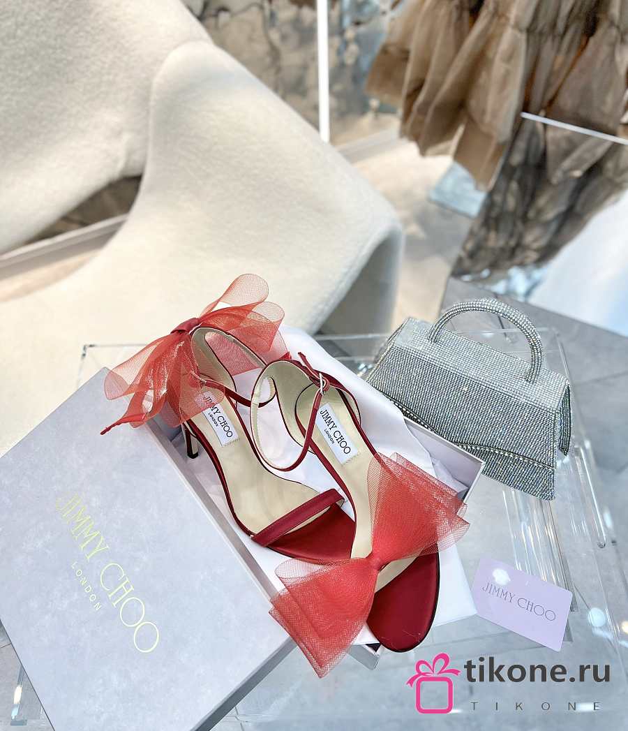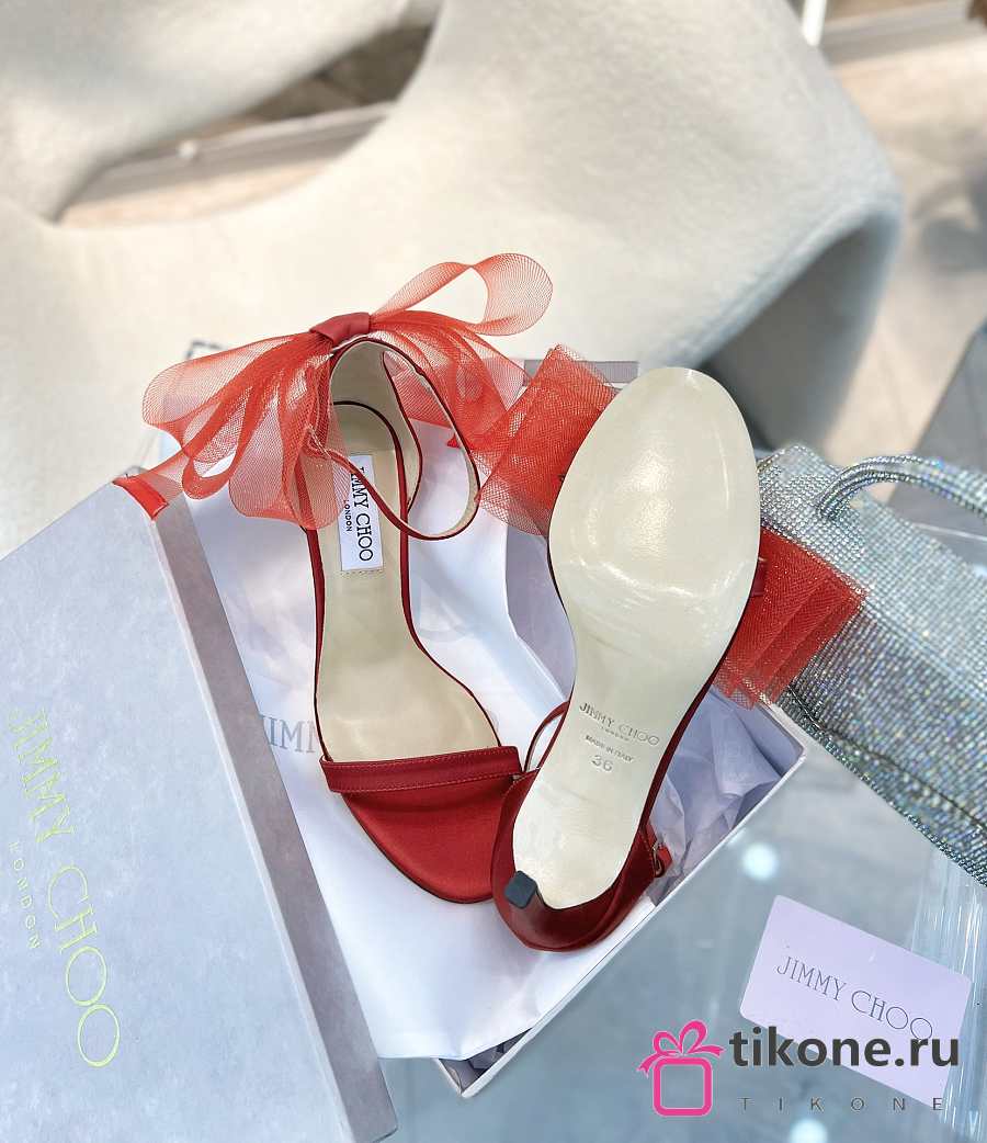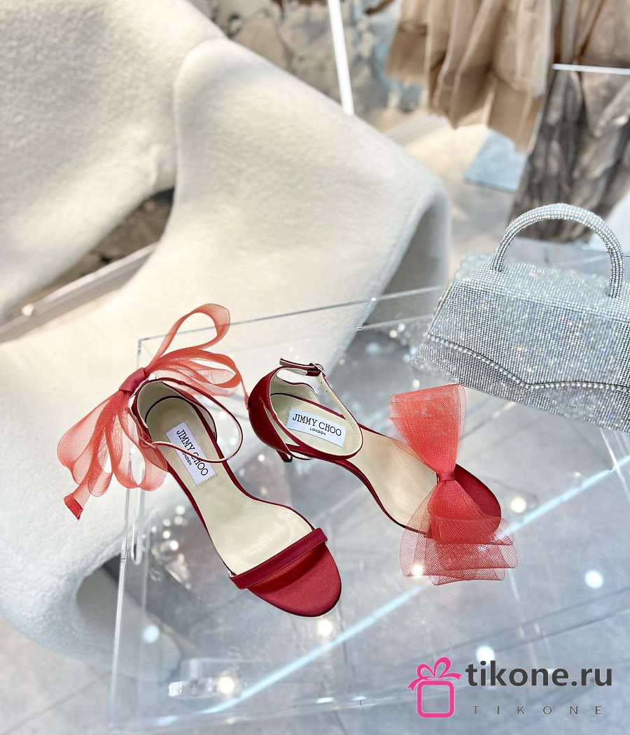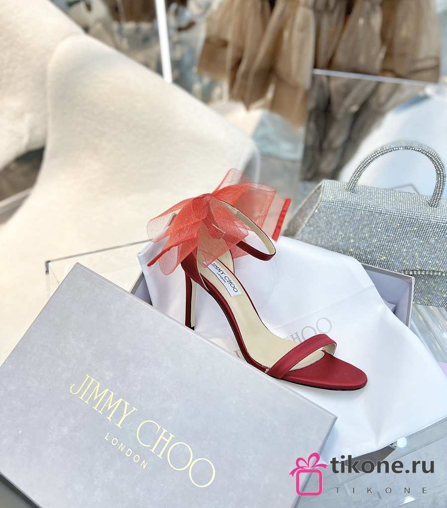Jimmy Choo Aveline 100 Red Sandals with Asymmetric Grosgrain Mesh Fascinator Bows
