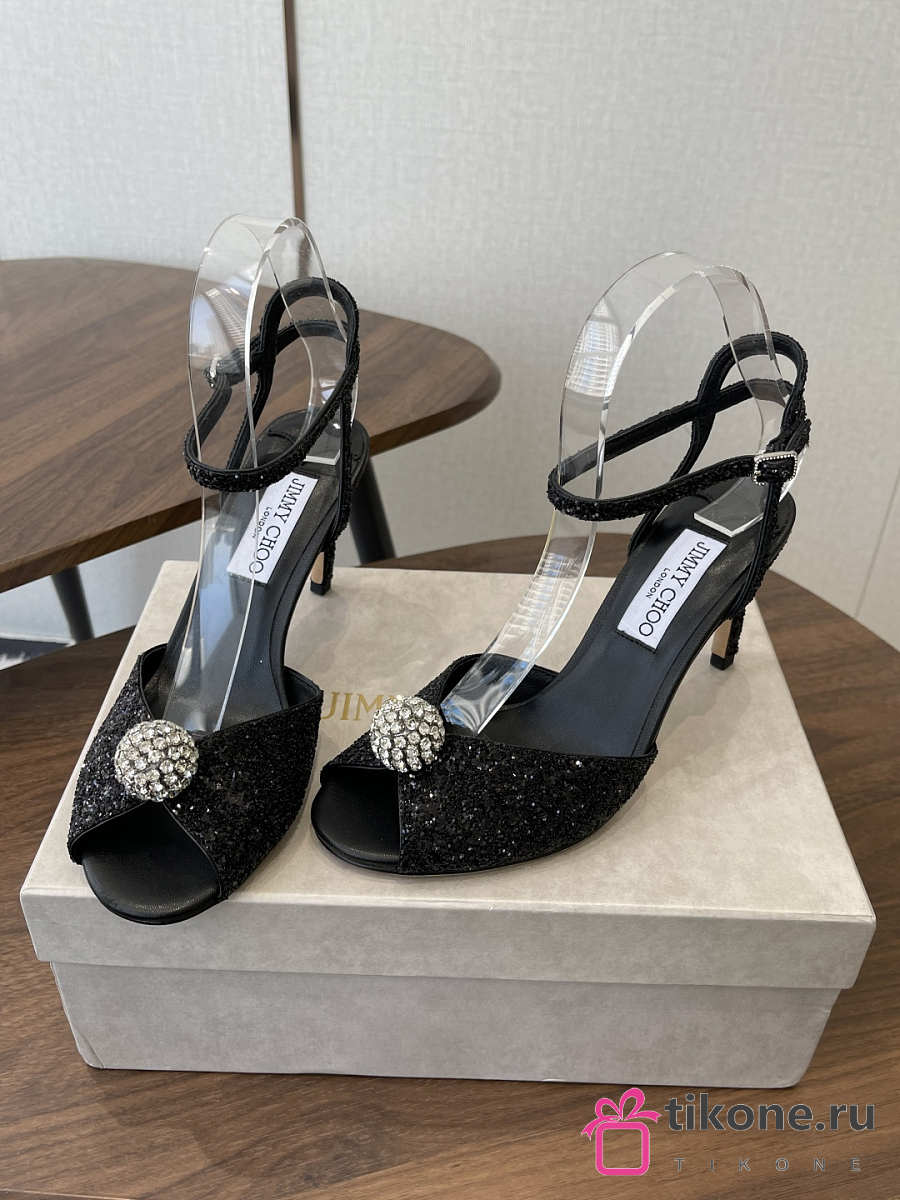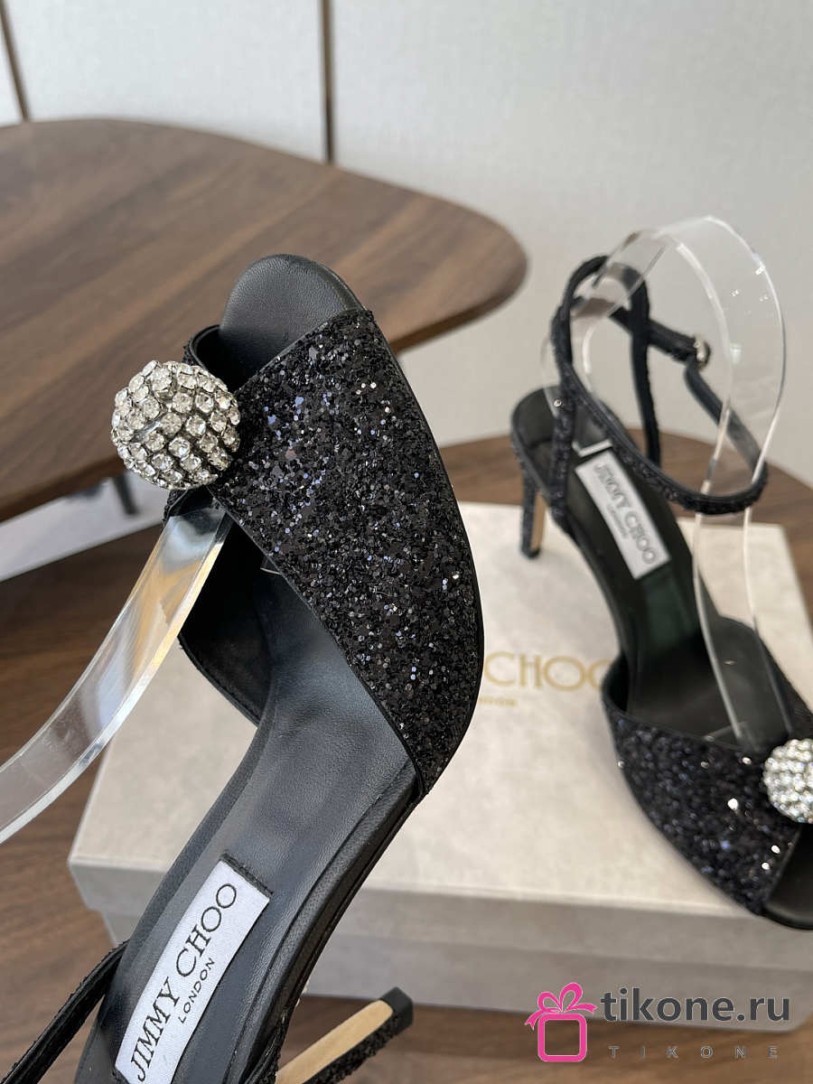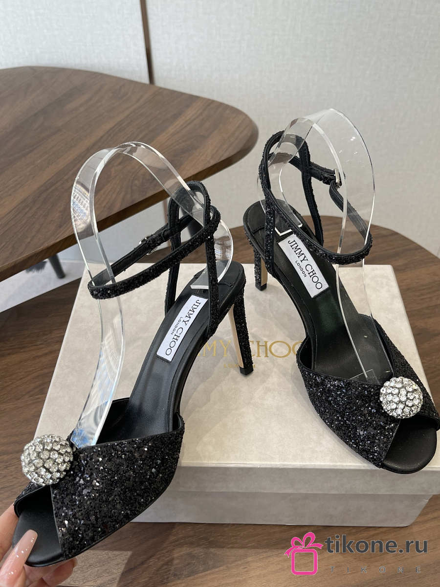Jimmy Choo Sacora 85 Black Glitter Fabric Sandals with Crystal Sphere