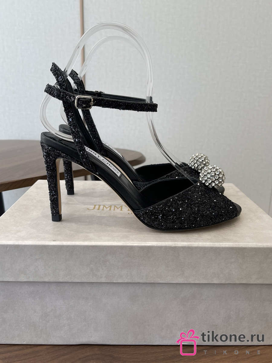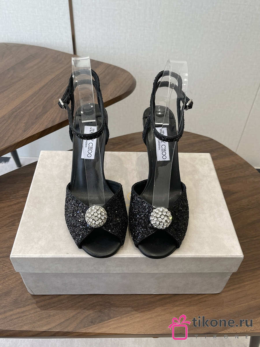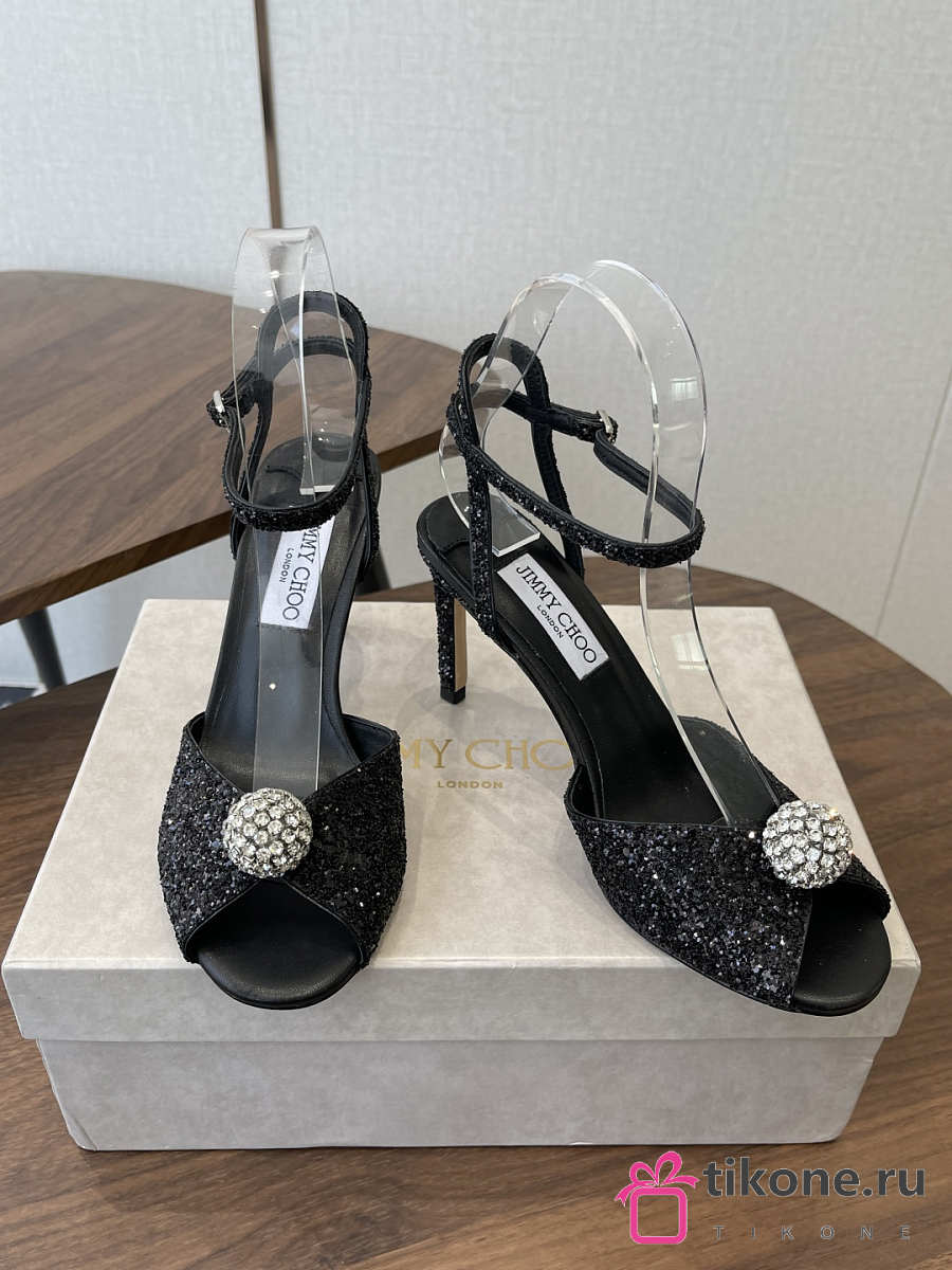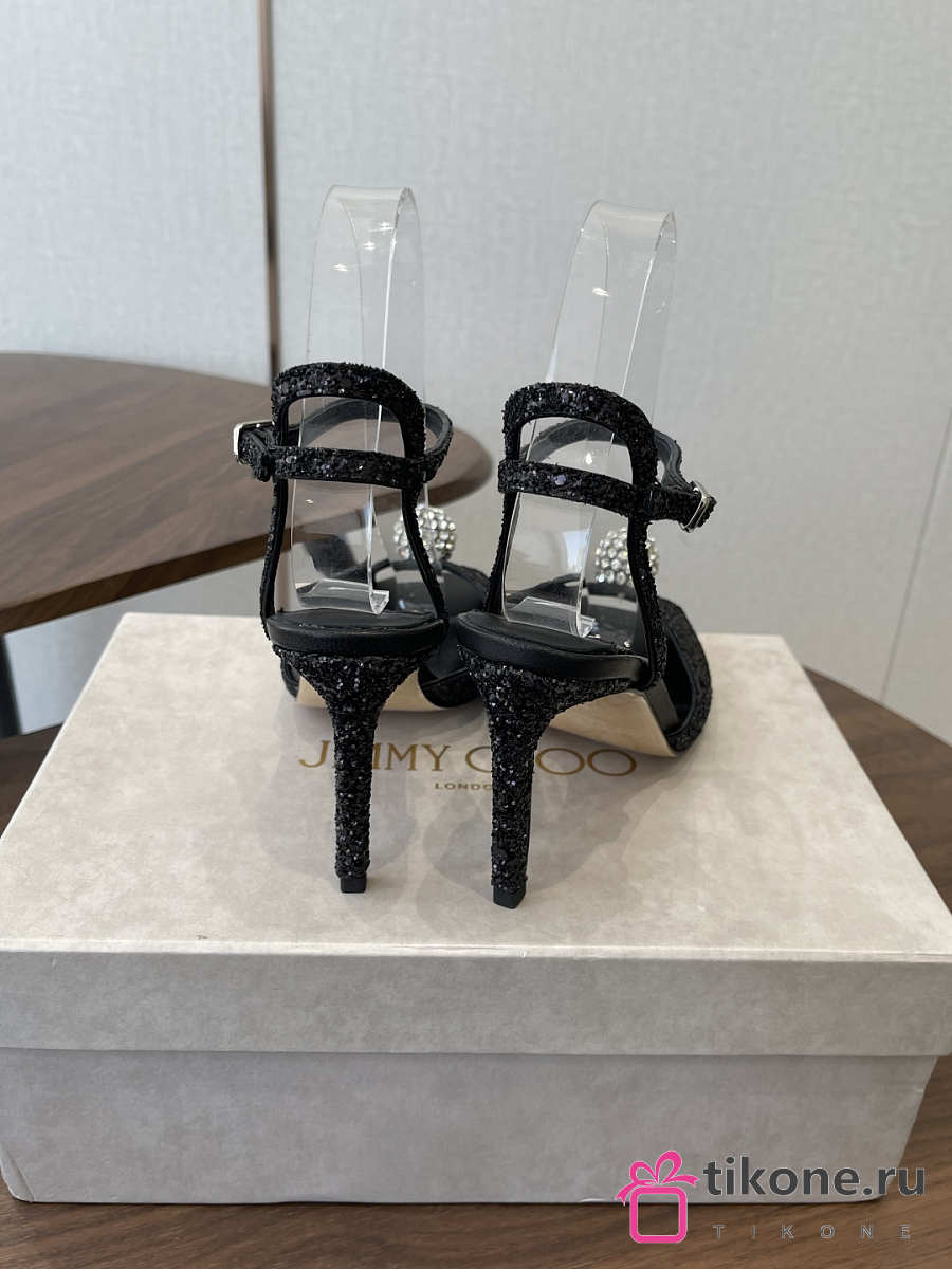 Jimmy Choo Sacora 85 Black Glitter Fabric Sandals with Crystal Sphere