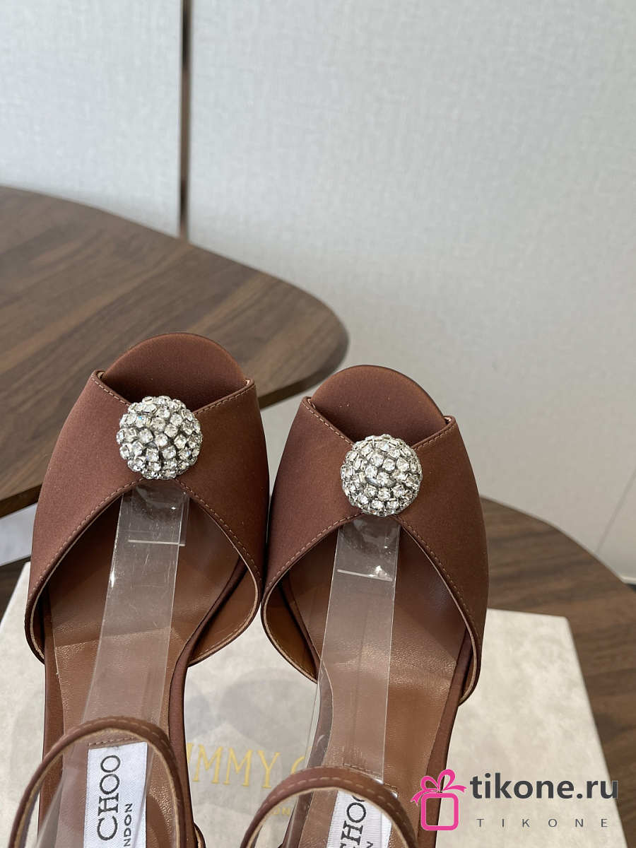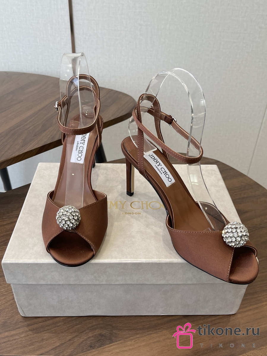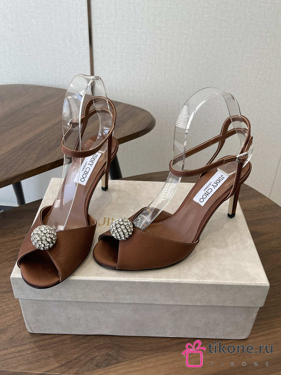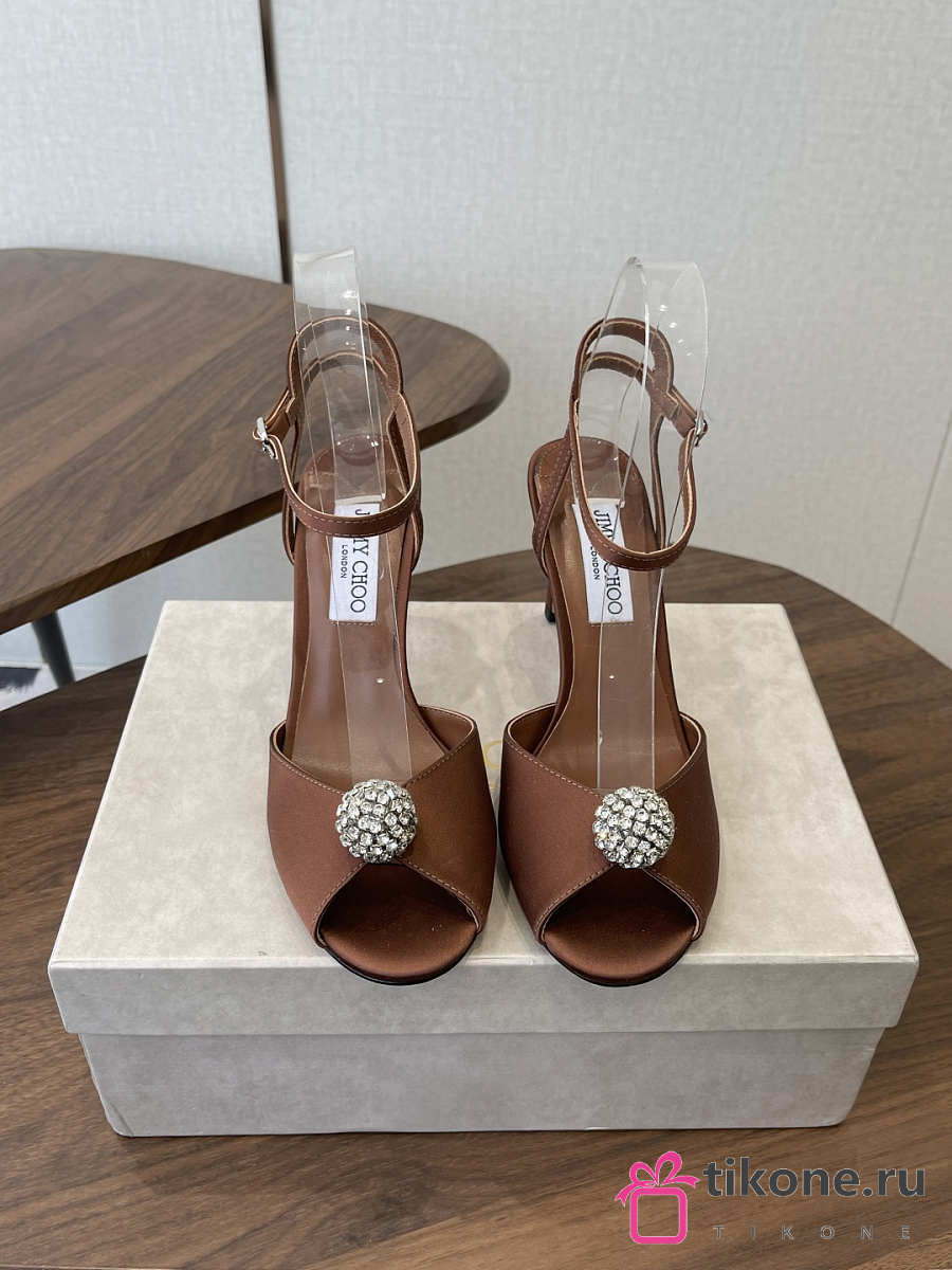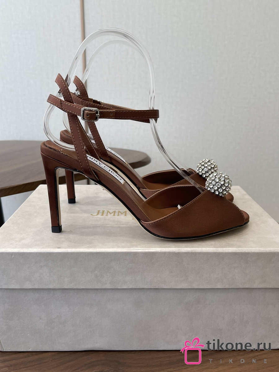 Jimmy Choo Sacora 85 Brown Satin Sandals with Crystal Sphere