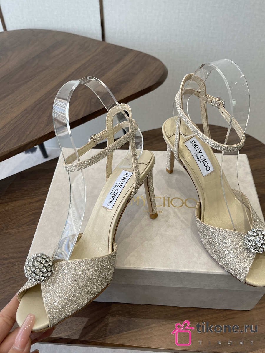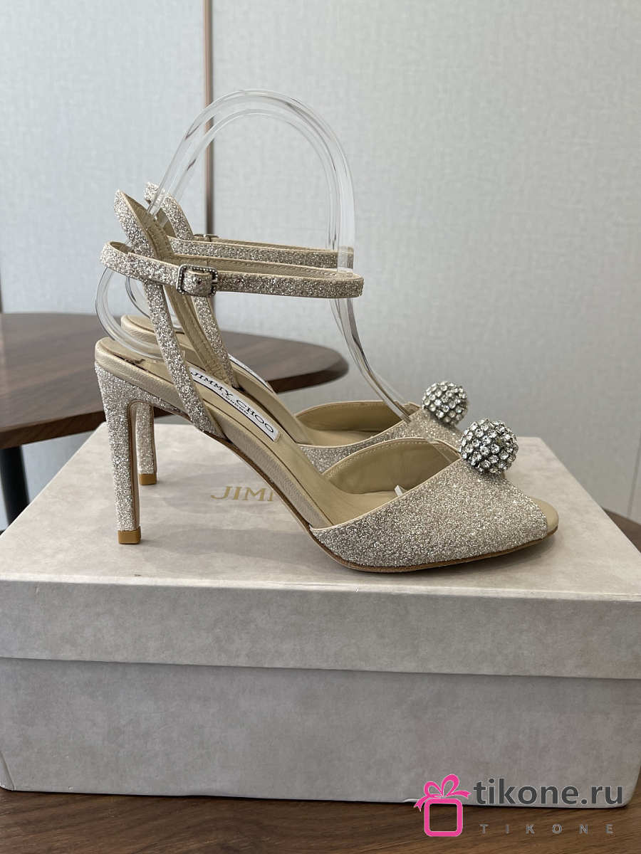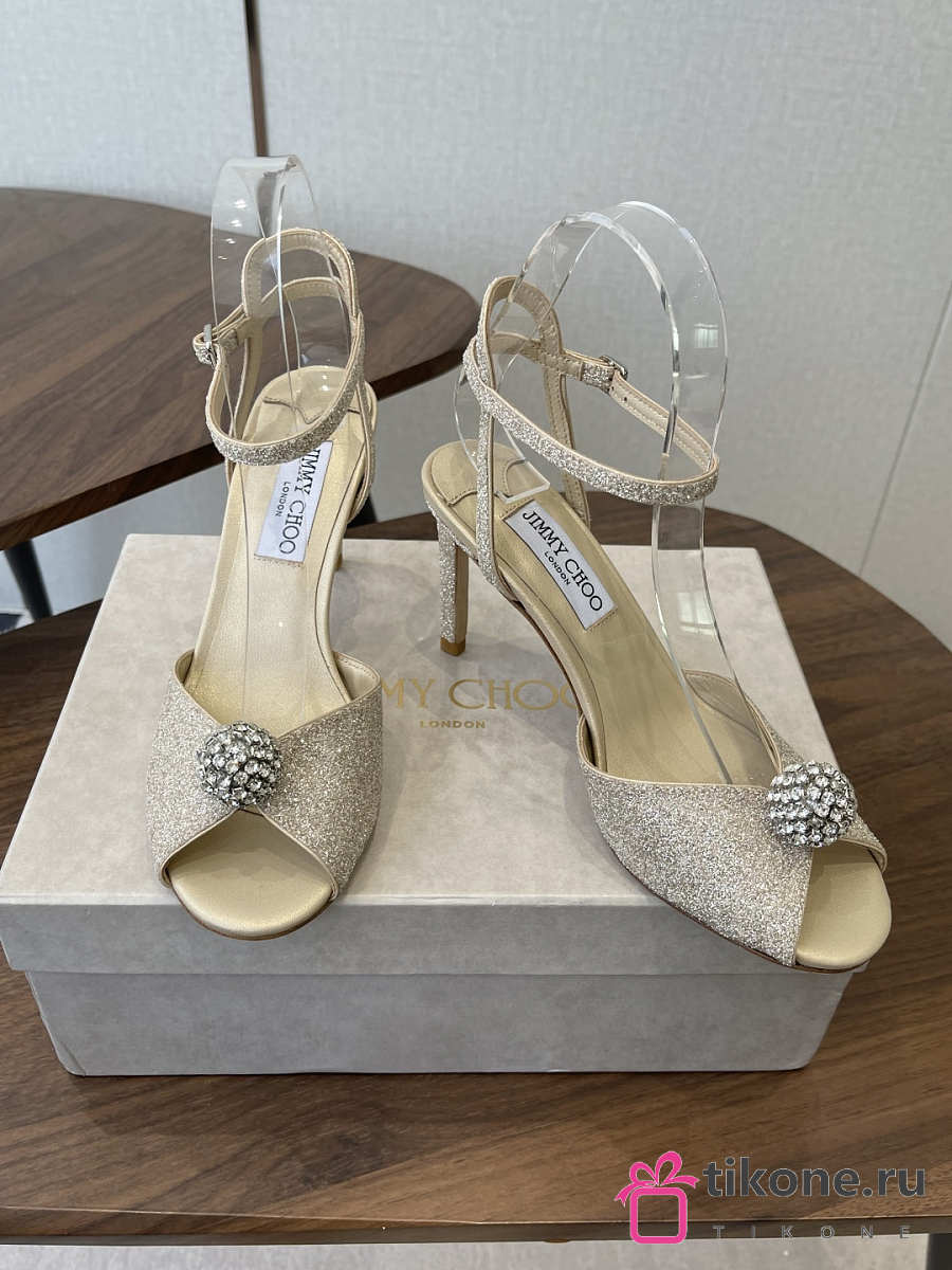 Jimmy Choo Sacora 85 Light Soft Gold Glitter Fabric Sandals with Crystal Sphere