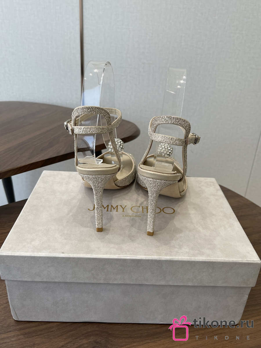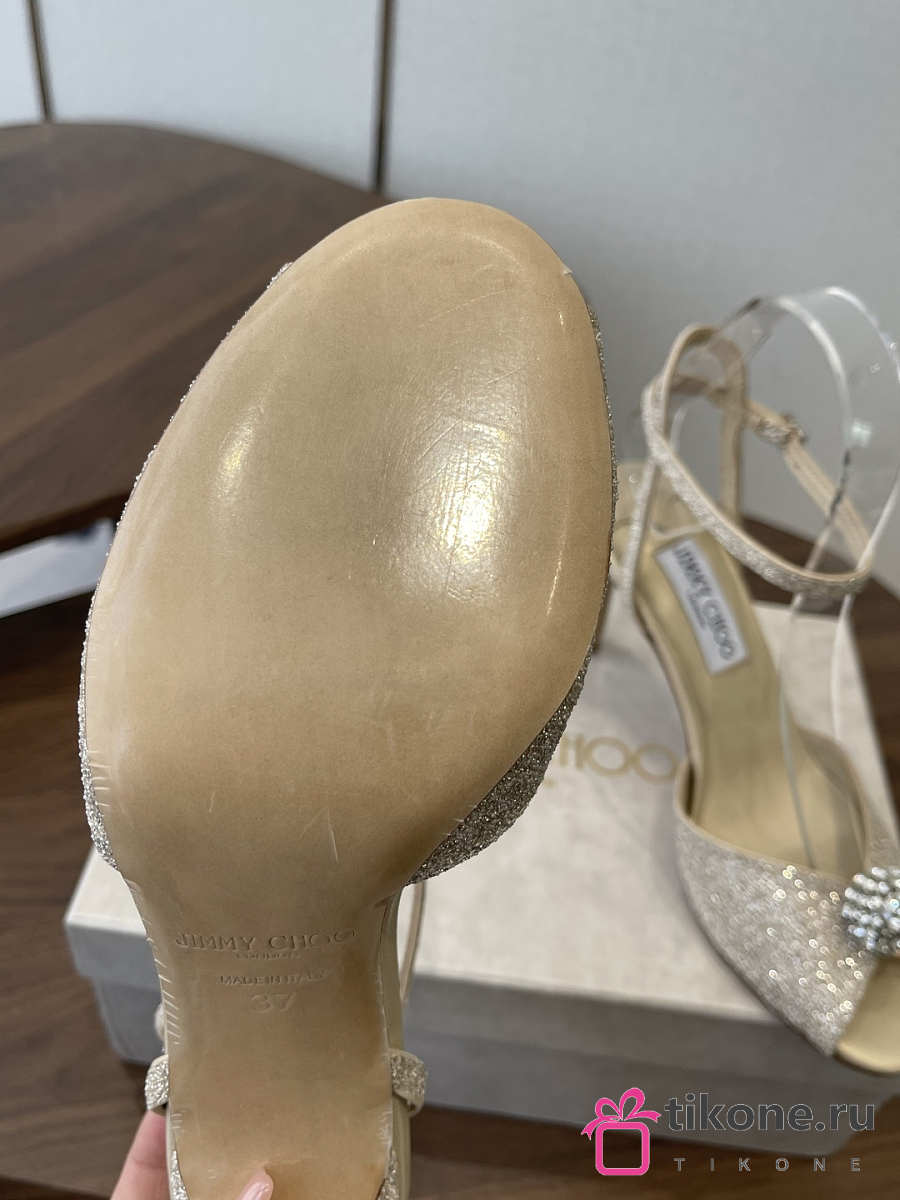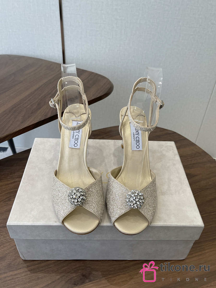 Jimmy Choo Sacora 85 Light Soft Gold Glitter Fabric Sandals with Crystal Sphere