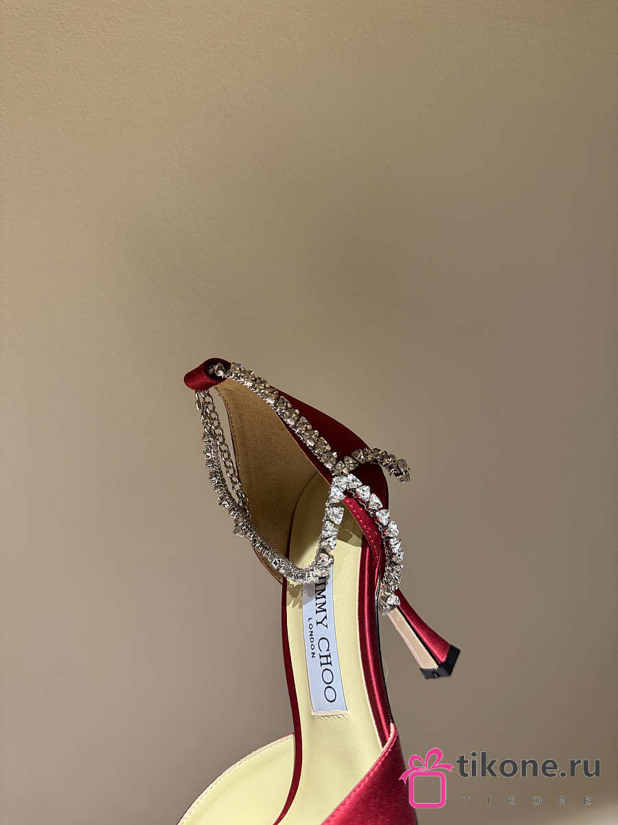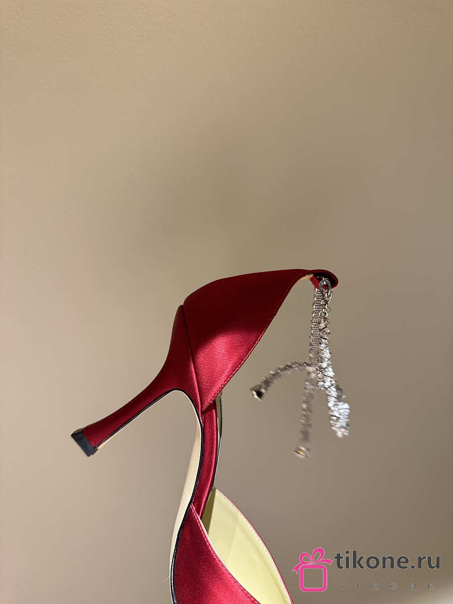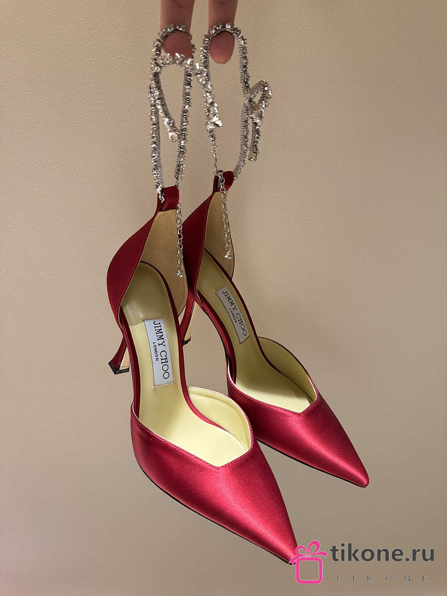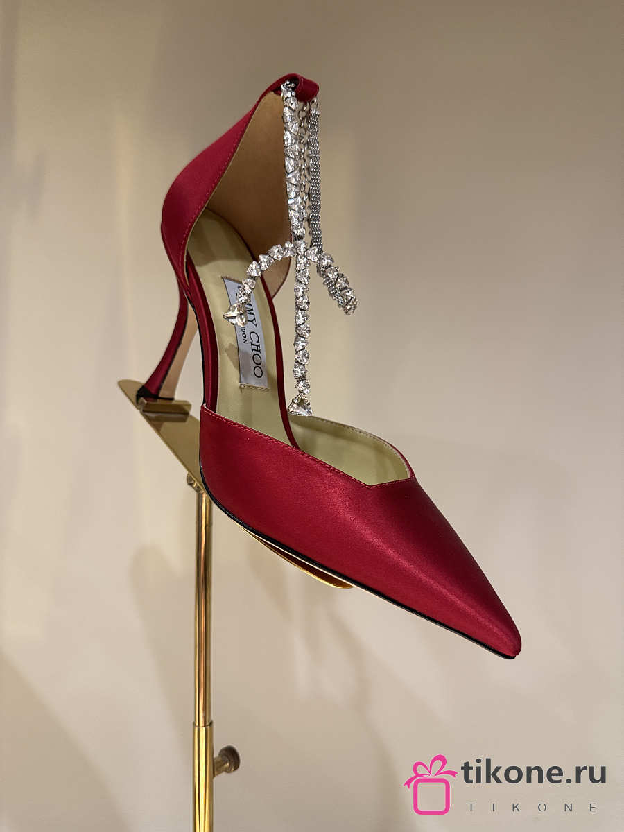 Jimmy Choo Saeda 100 Red Satin Pumps with Crystal Embellishment