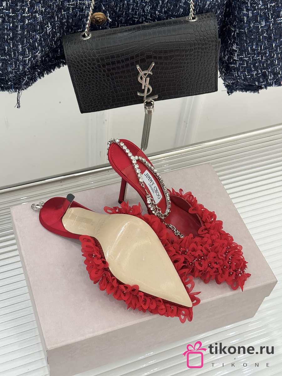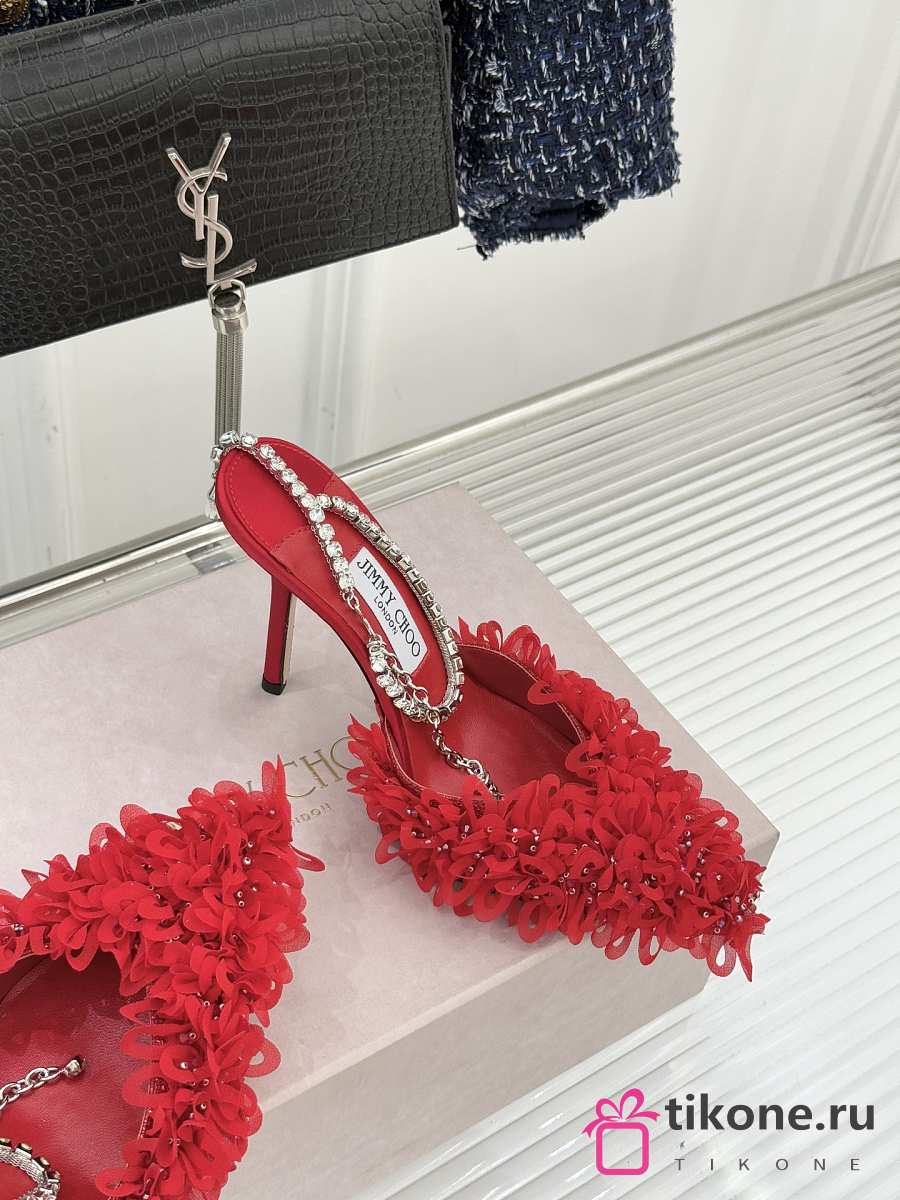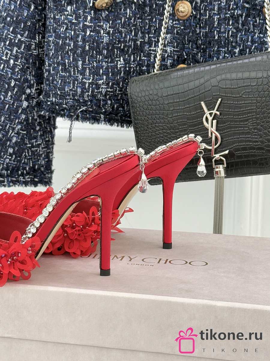 Jimmy Choo Saeda 100 Ruby Red Mesh Pumps with Petal Embroidery