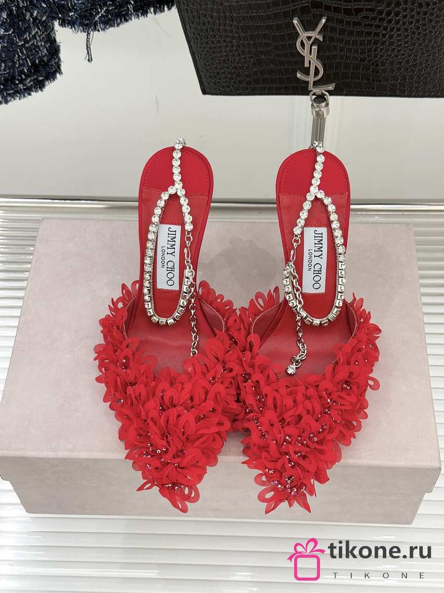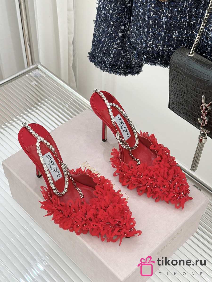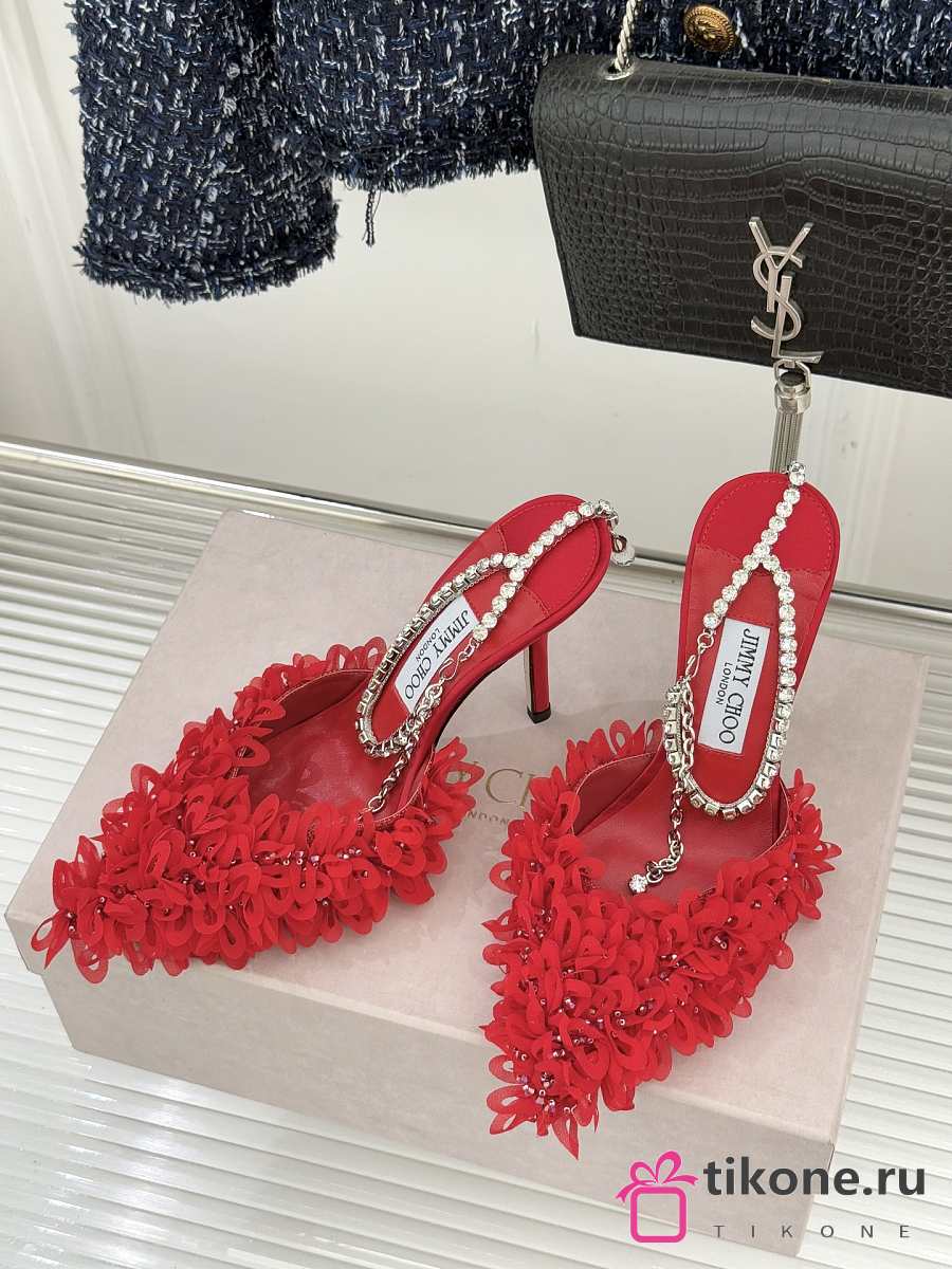 Jimmy Choo Saeda 100 Ruby Red Mesh Pumps with Petal Embroidery