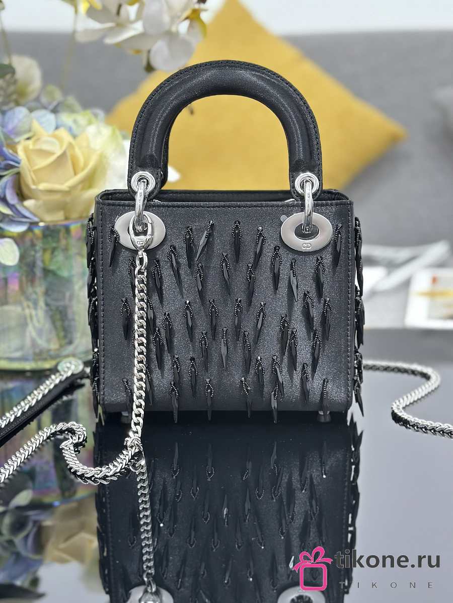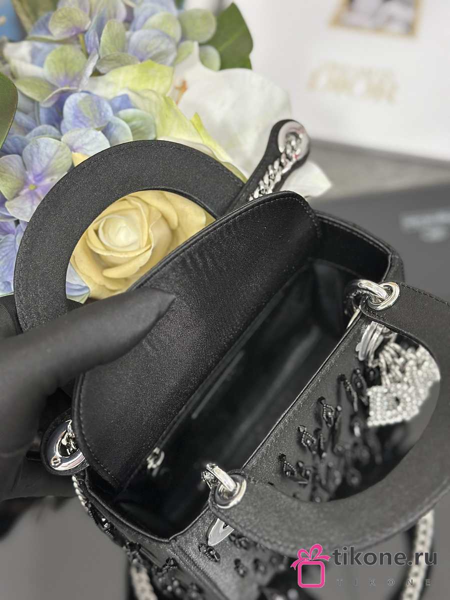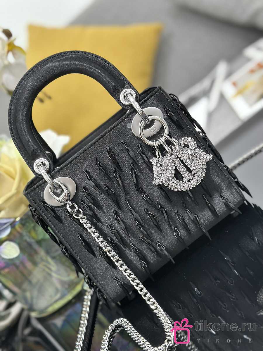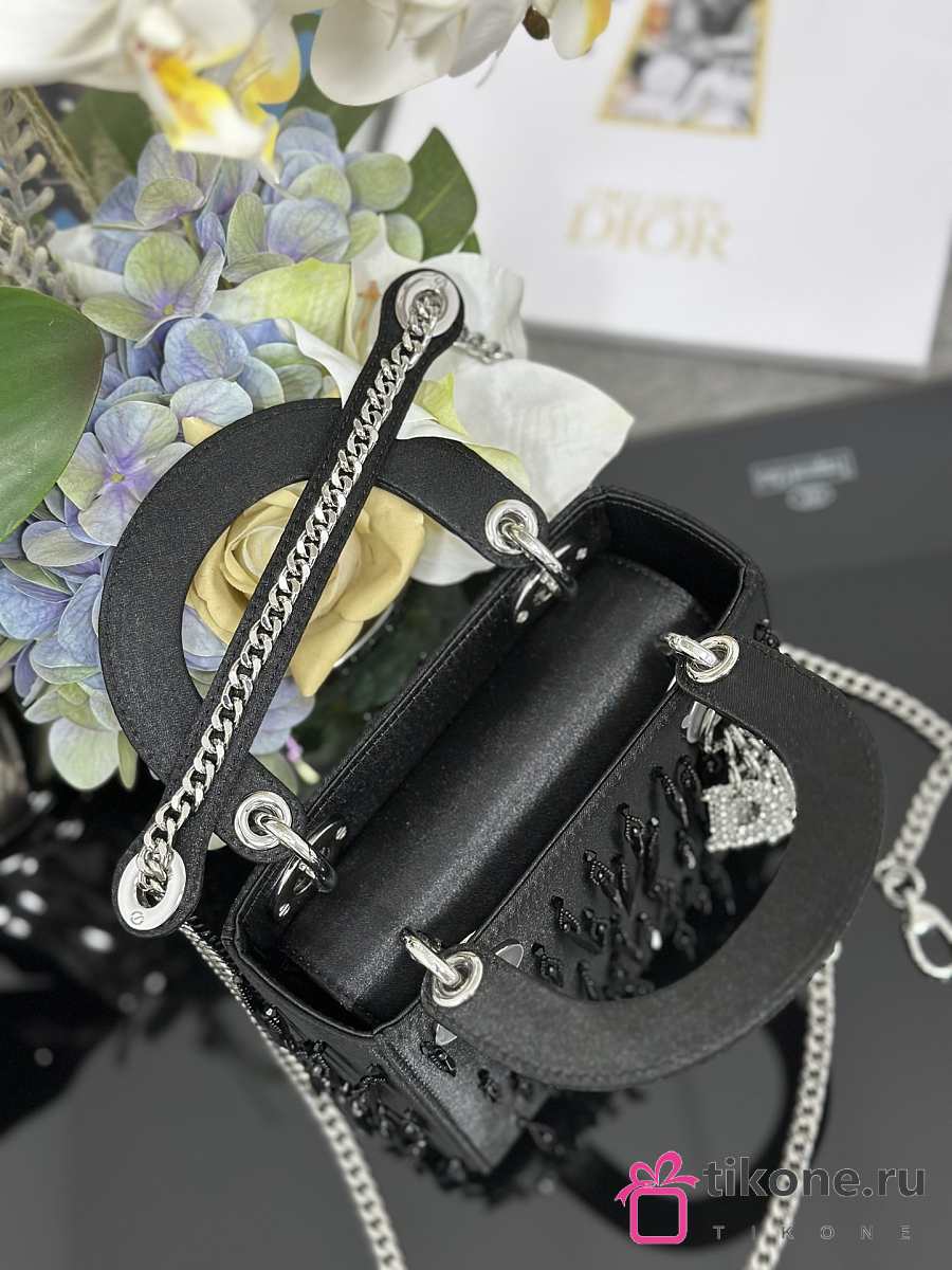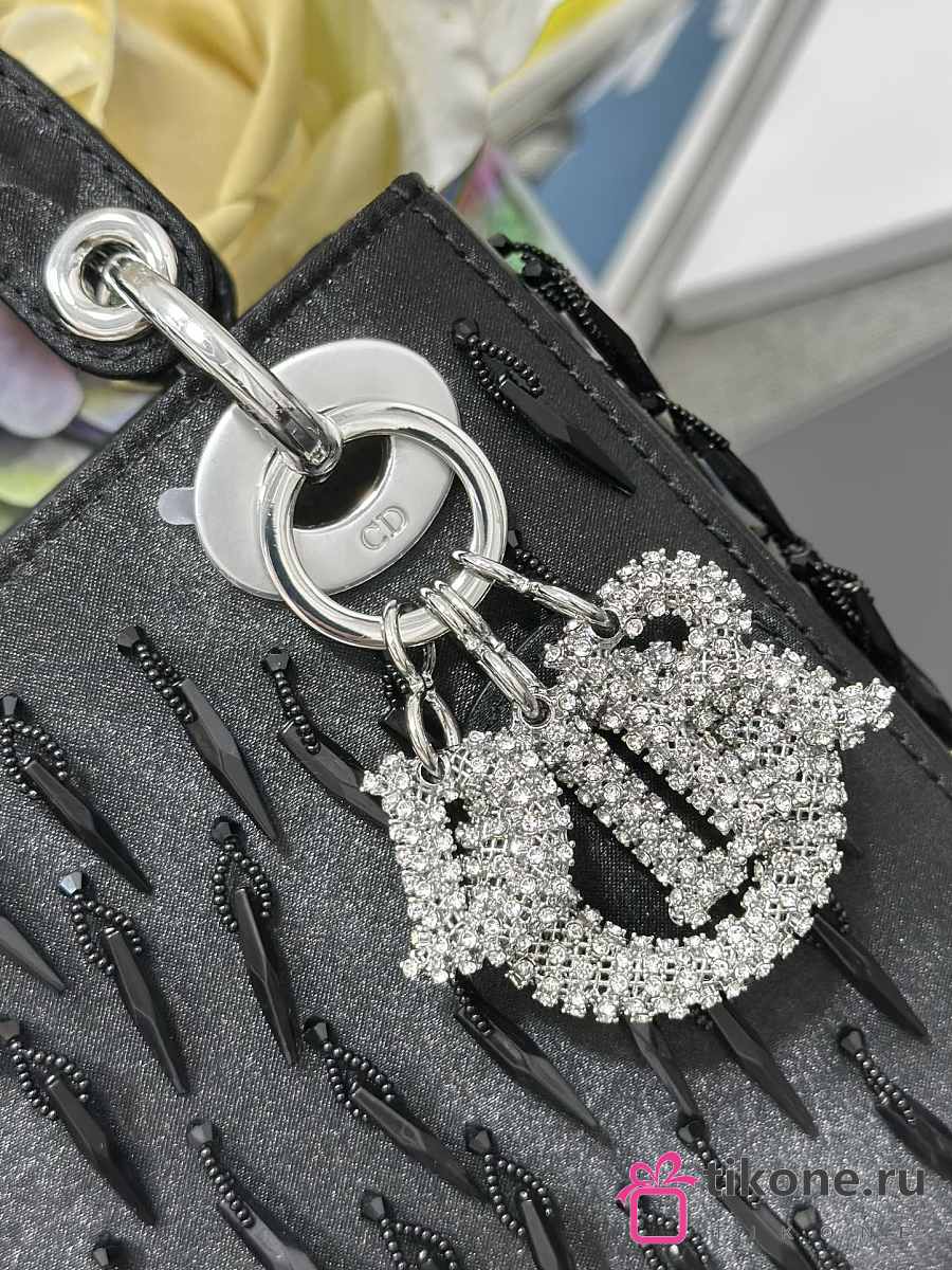 Lady Dior Black Satin with Beaded Embellishments & Rhinestone Charms - 17x15x7cm