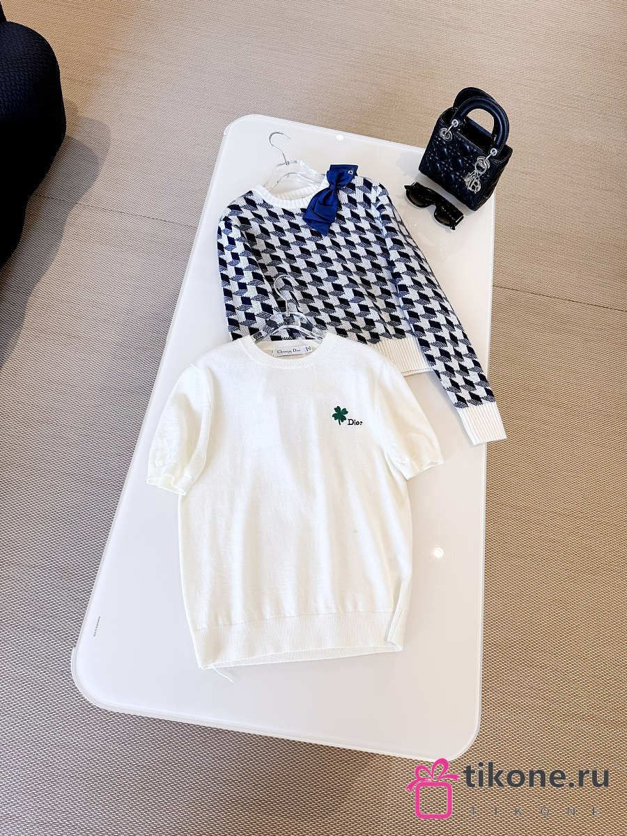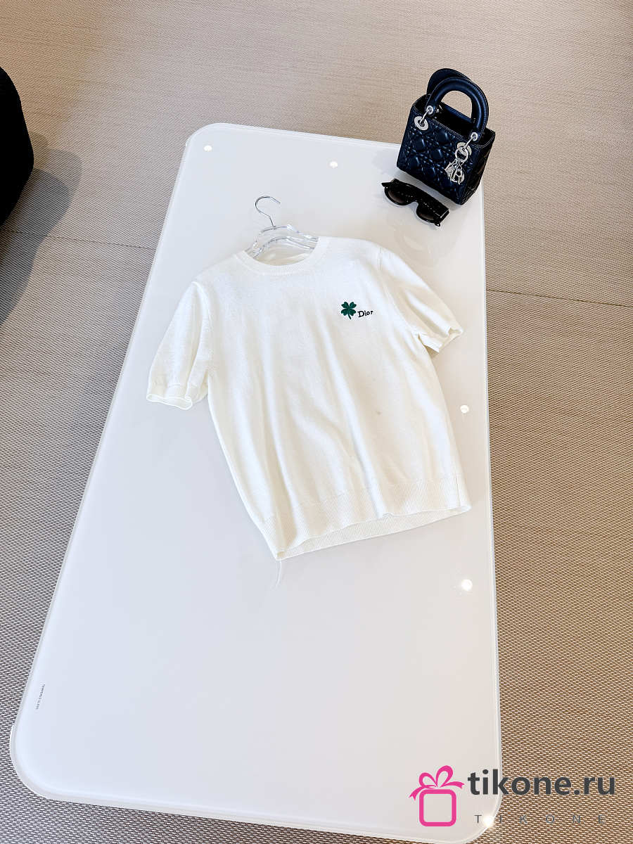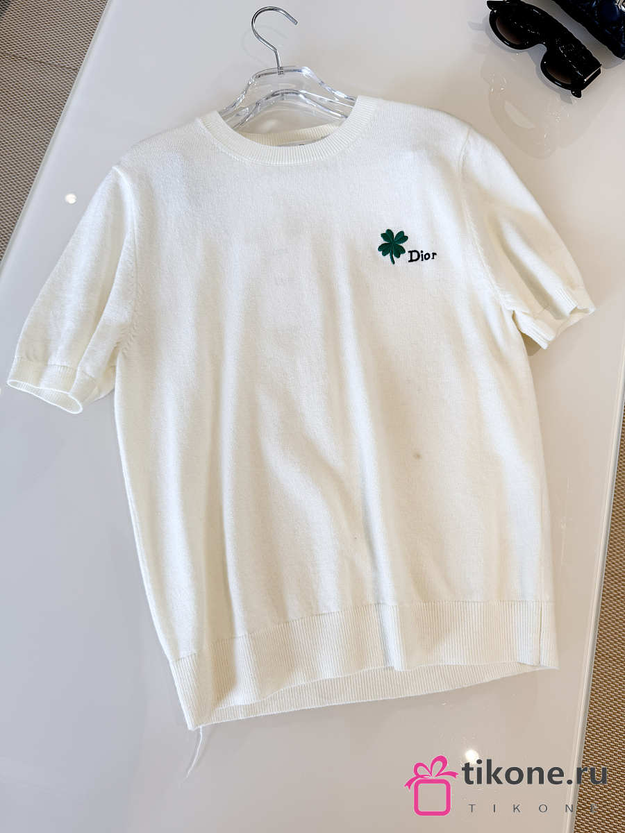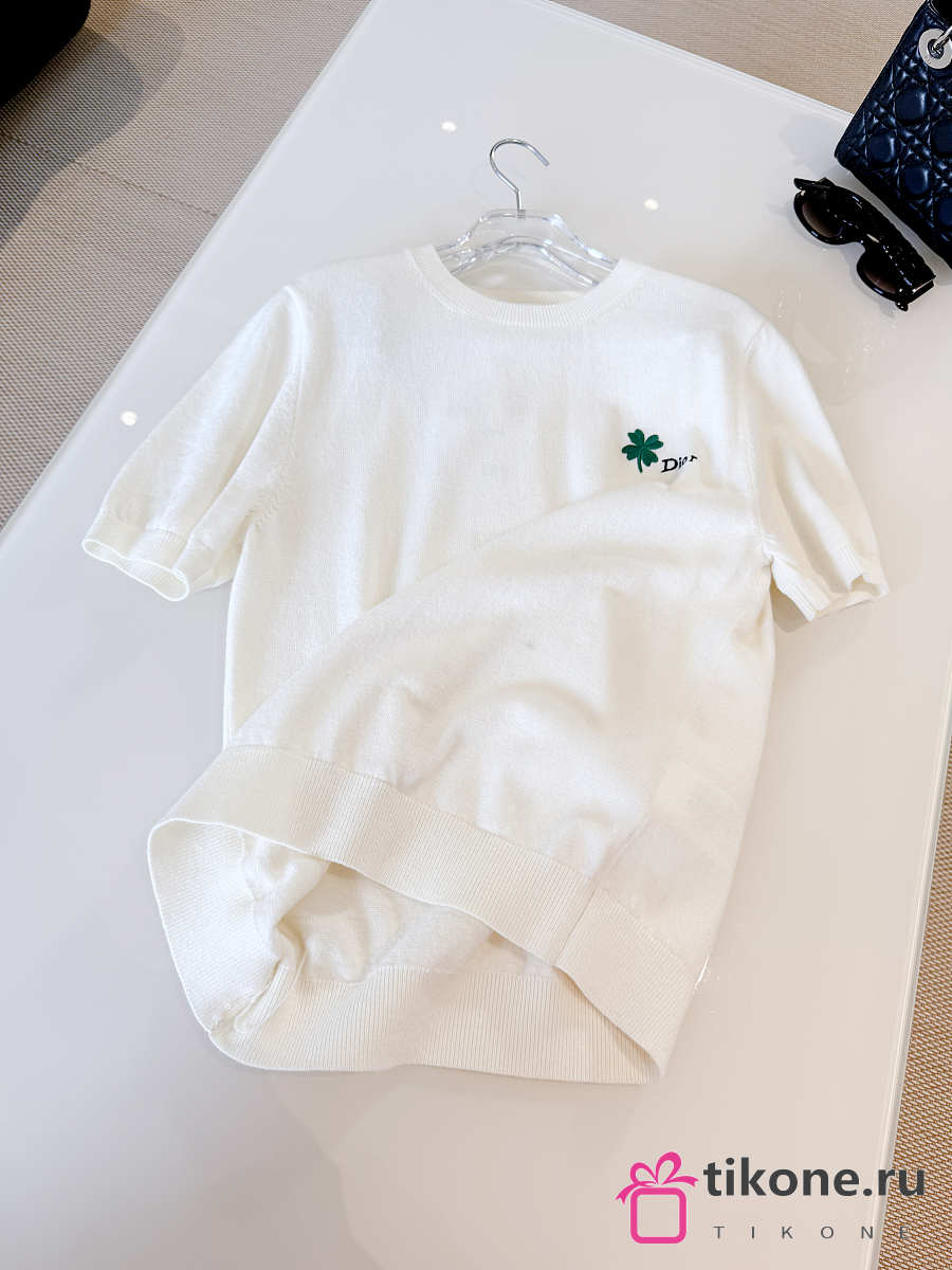 Short-Sleeved Fitted Sweater White Wool Knit with Green and Black Dior Clover Signature
