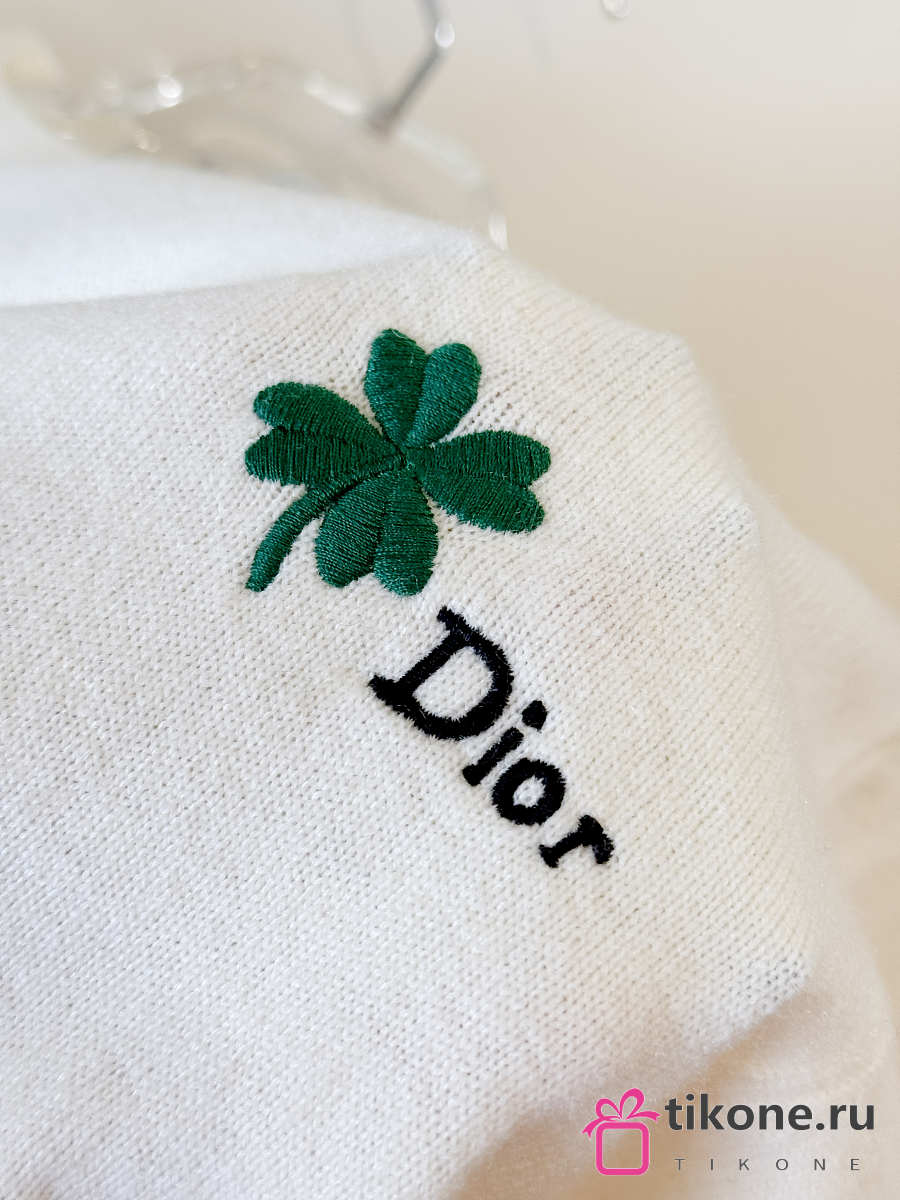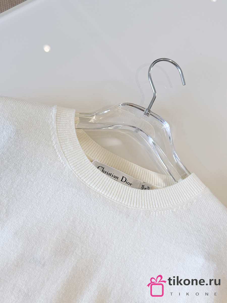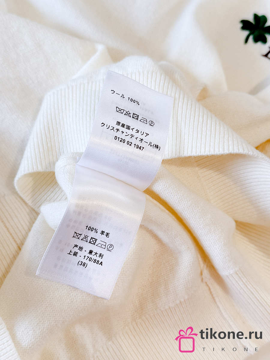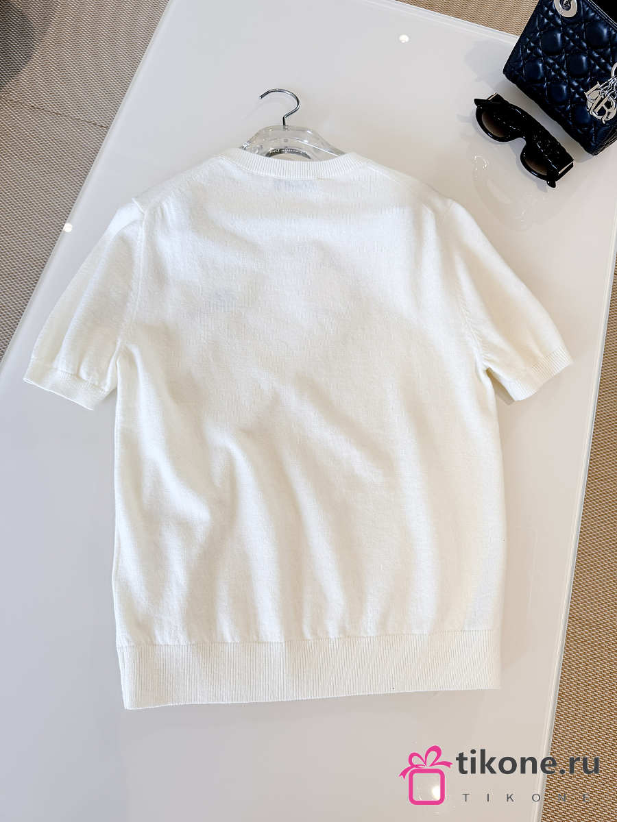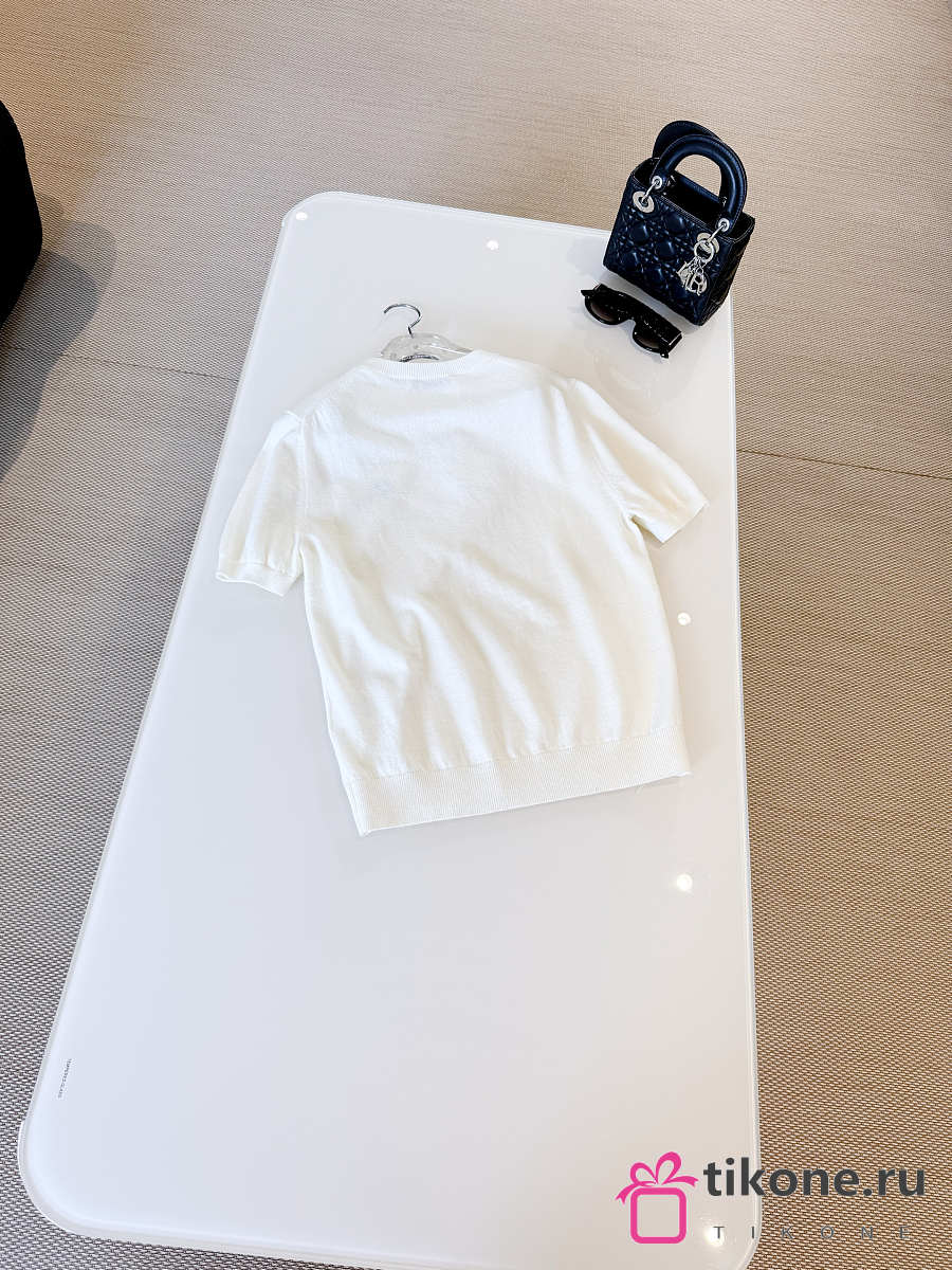 Short-Sleeved Fitted Sweater White Wool Knit with Green and Black Dior Clover Signature