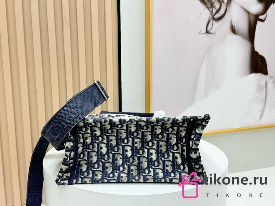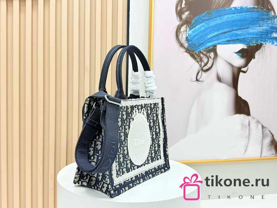 Small Dior Book Tote with Strap Blue Dior Oblique Embroidery and White Lace - 26.5x22x14cm